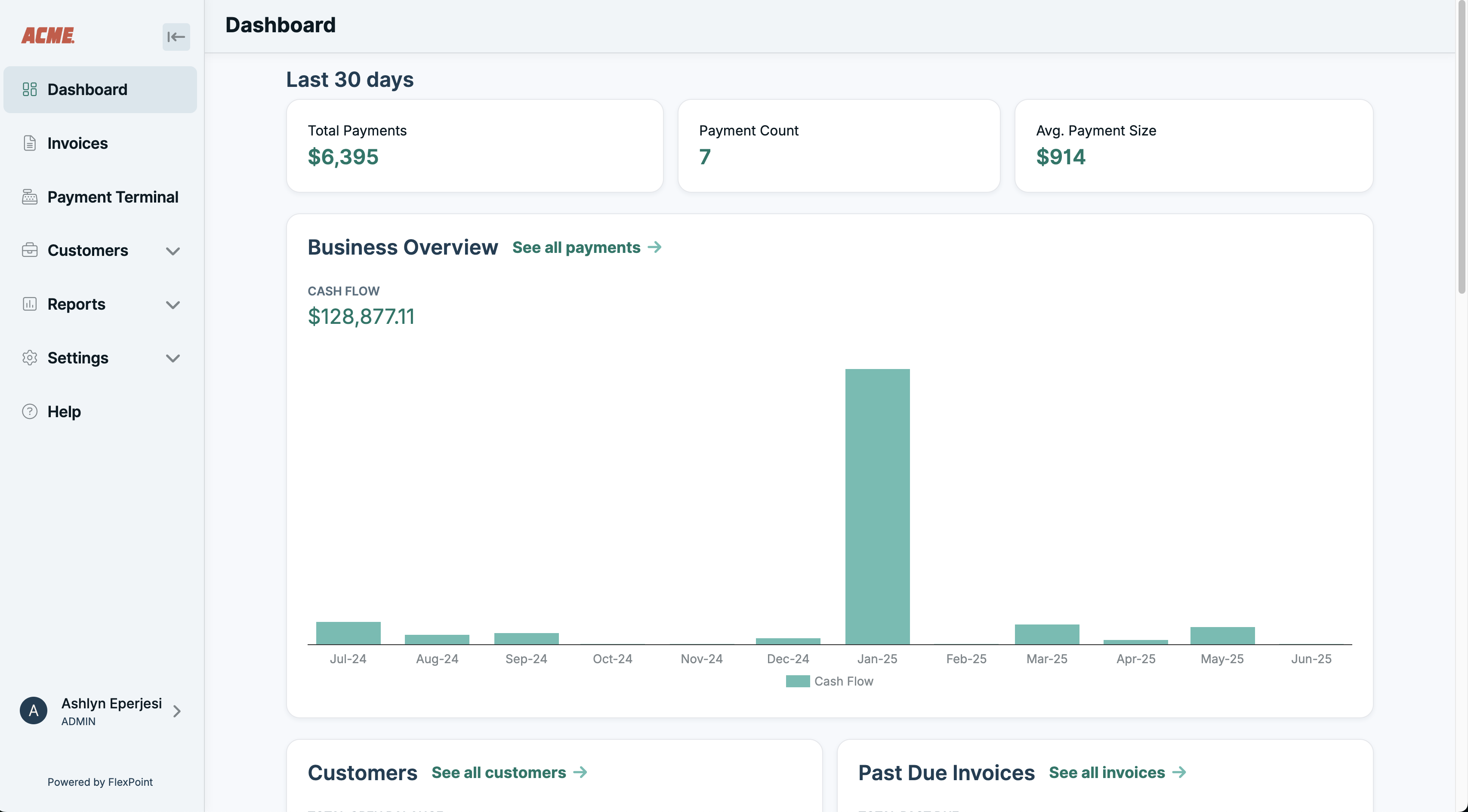 Quick view your total payments, payment count, average payment size, and a broader business overview of your cash flow by month.