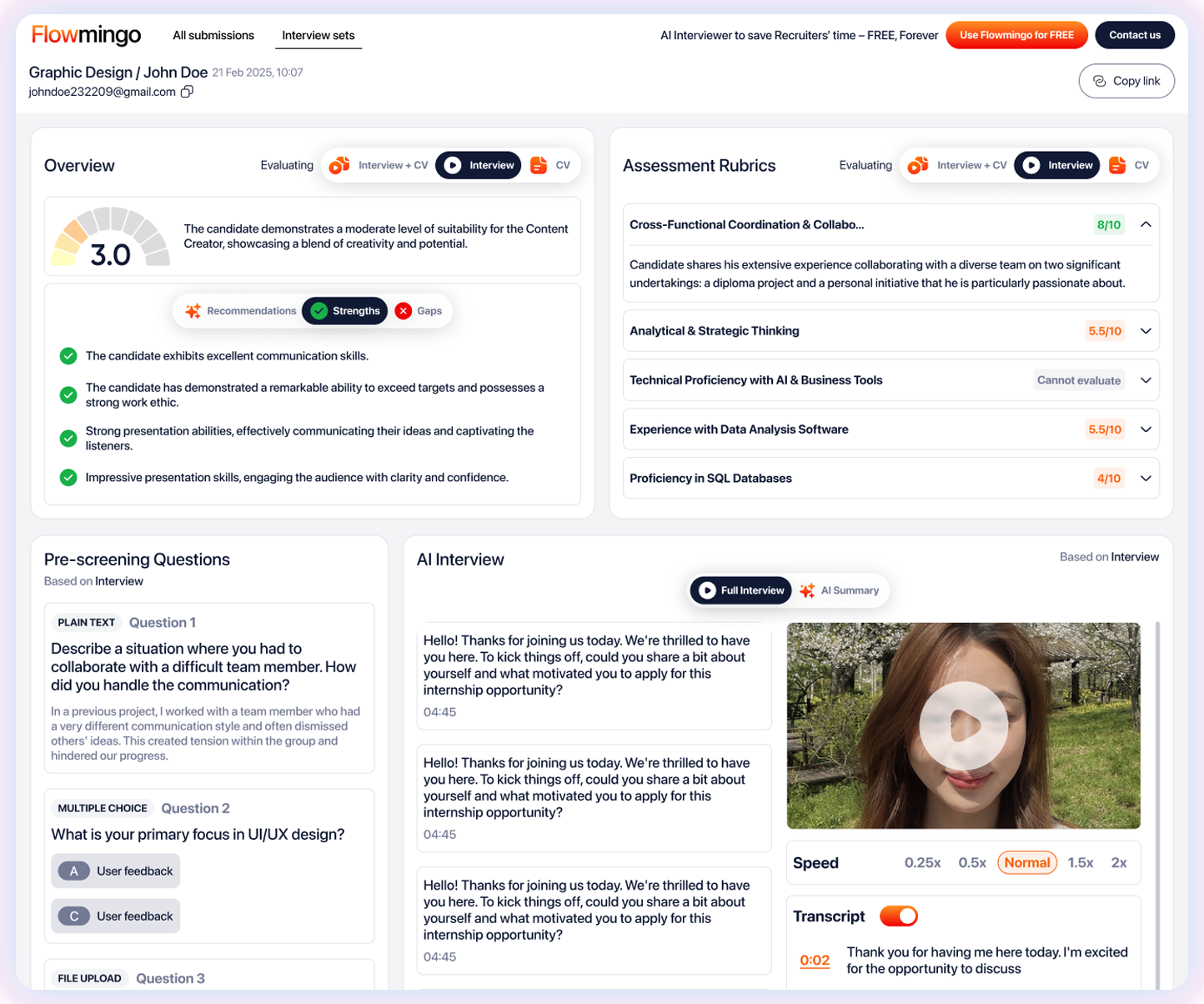 I think the upside of Flowmingo is that it is really customer-oriented. It means that whenever I give a feedback, the product team will take into account and then they will immediately apply it. Like last week, I gave a feedback about I want it to be more details for the AI to ask the candidate the right question, then they actually implemented it. So it is quite pleasant to use and knowing that they always listen is a major upside for the platform Review collected by and hosted on G2.com.