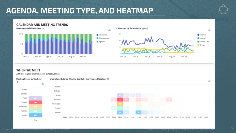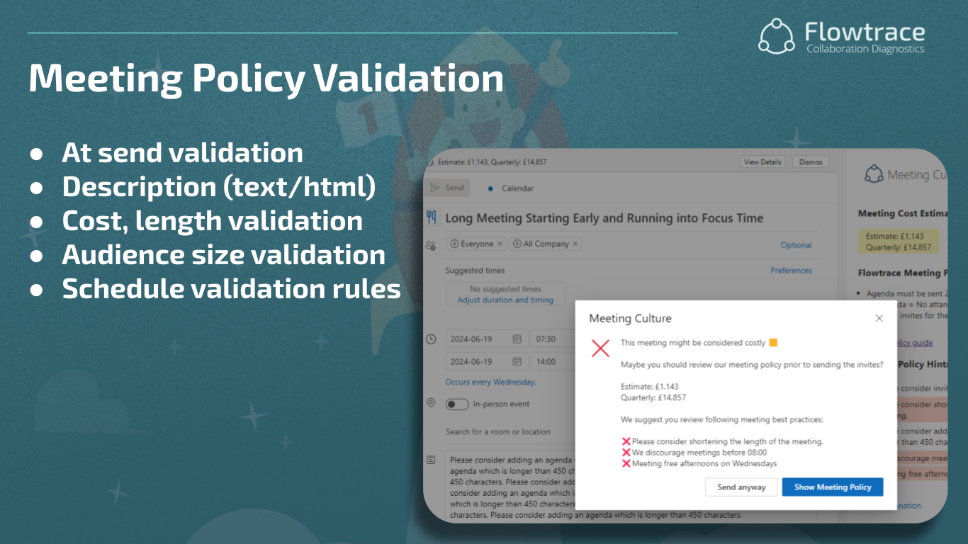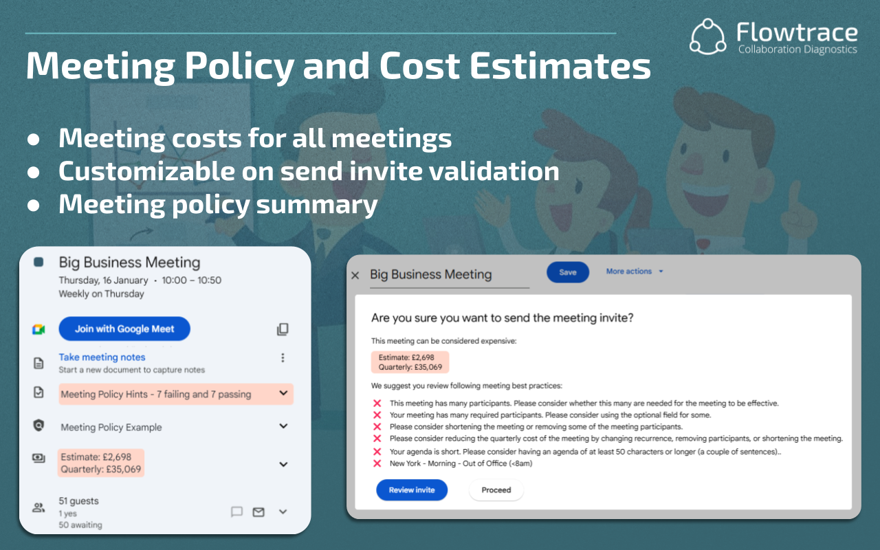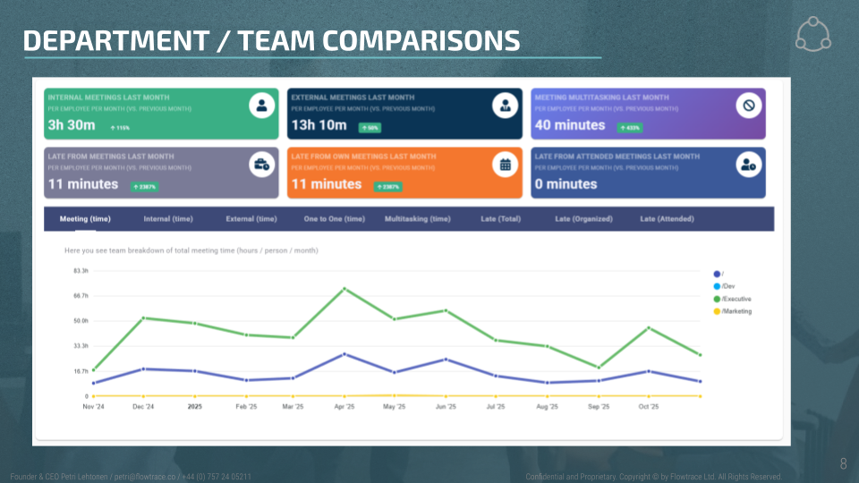 We go beyond basic metrics to offer deep insights into meeting culture, helping you break down communication barriers, eliminate meeting fatigue, and achieve true cross-functional alignment. Our unique approach focuses on team-level metrics, ensuring privacy and building trust, rather than individual monitoring. With Flowtrace, you gain a complete toolset for meeting organizers and attendees, driving better business outcomes through gamified insights and expert guidance.