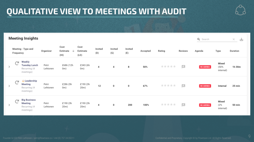 Join hundreds of clients who have already transformed their meeting culture with Flowtrace, experiencing increased productivity, enhanced talent retention, and a more meaningful way of working. Discover how to make every meeting count.
