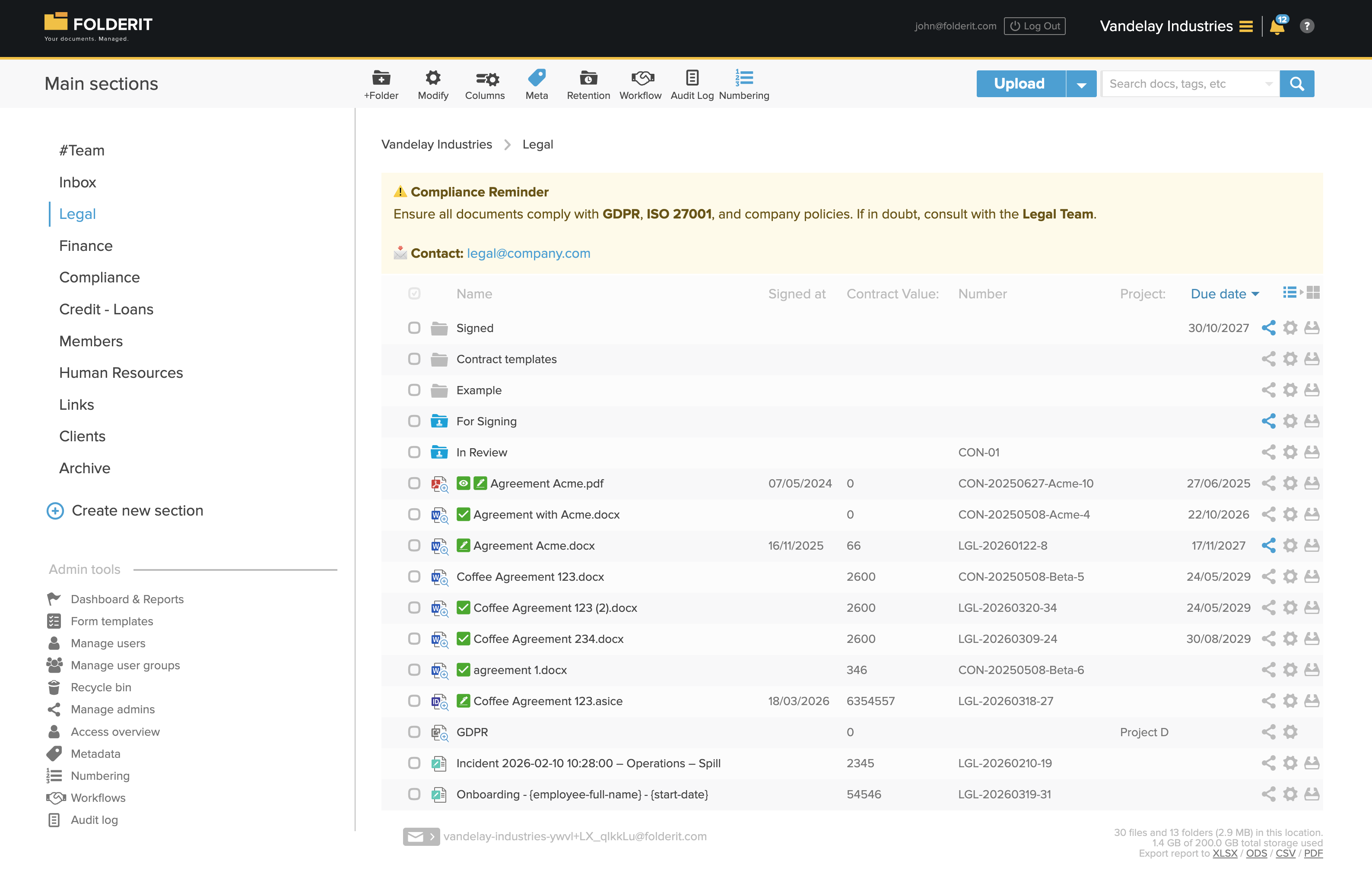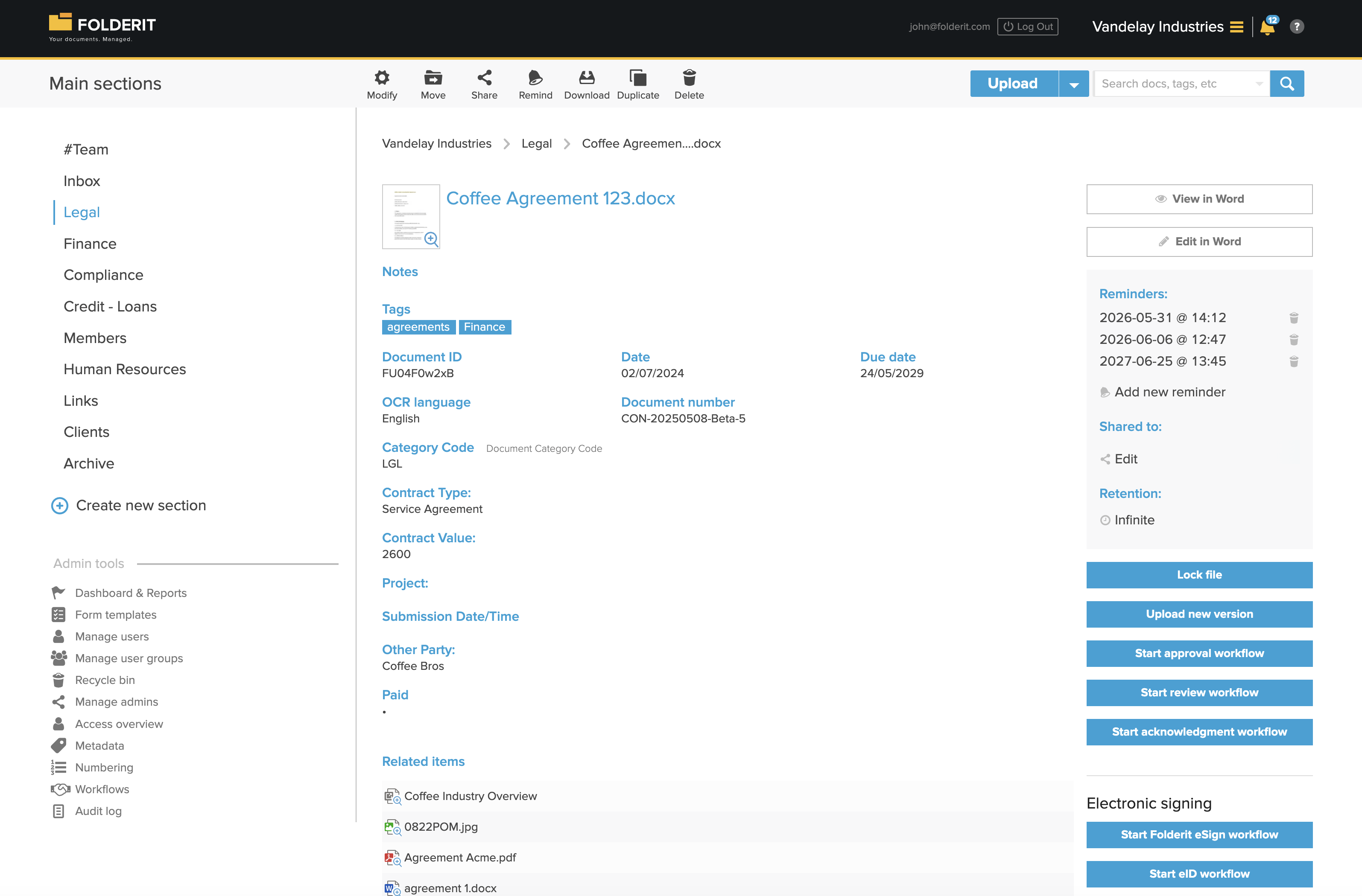 Folderit is used by organizations that manage operational, compliance, quality, HR, finance, project, and governance-related documents and need a clear way to keep information organized, accessible, and up to date. The system supports both everyday document storage and more controlled document processes, including approval workflows, acknowledgement tracking, review cycles, and electronic signing. It can be used by small and mid-sized organizations as well as larger teams that need structured document control without relying on scattered folders, email-based approvals, or manual follow-up.