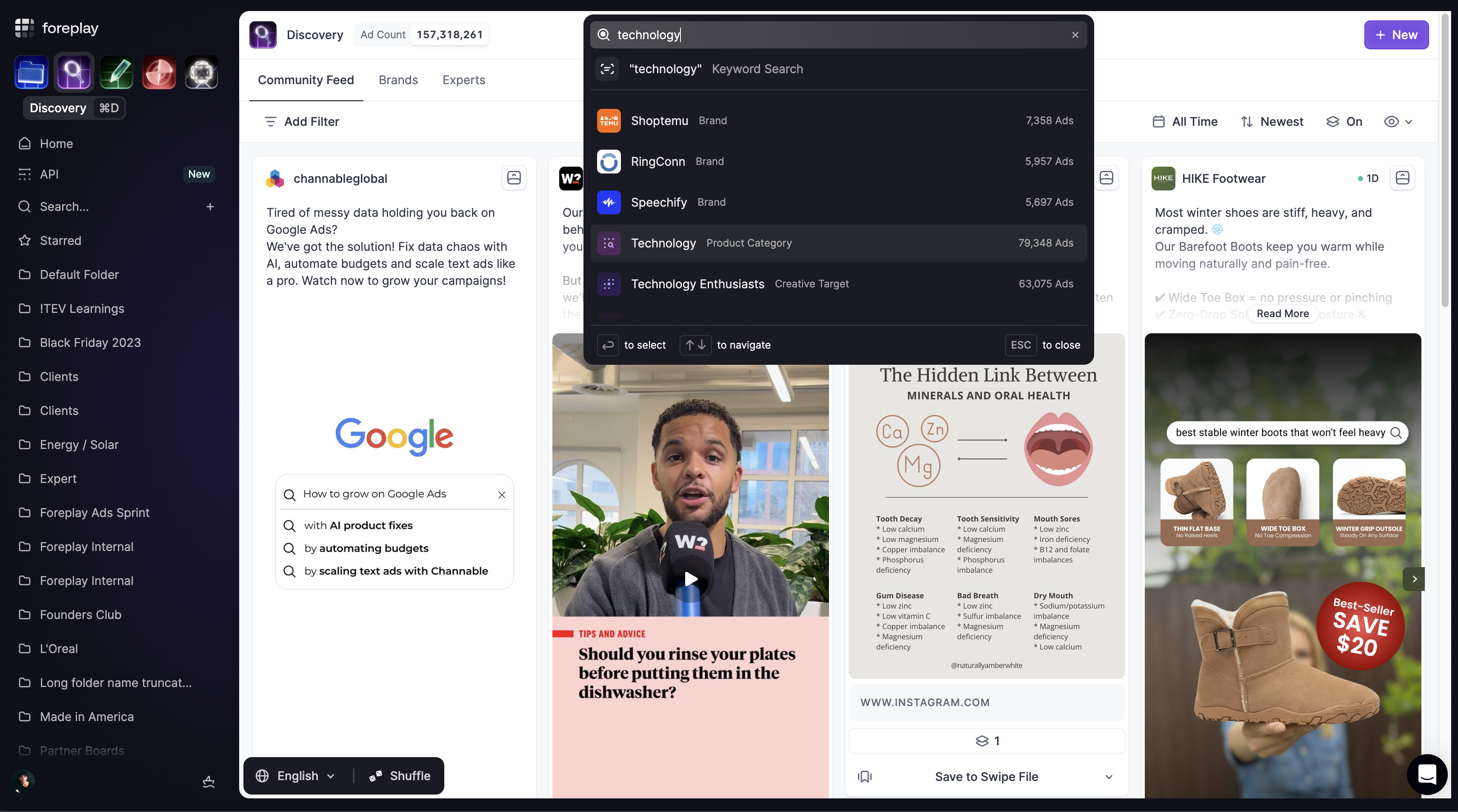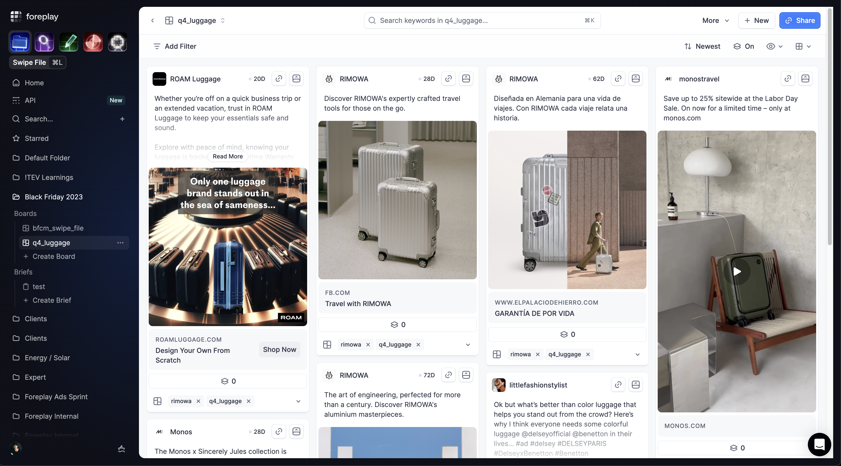 Foreplay also accelerates execution. Teams can turn saved ads and insights into structured creative briefs, storyboards, and shareable collections, ensuring alignment between strategists, media buyers, and creative teams. Collaboration features like folders, tags, links, and team workspaces make it easy to manage inspiration and insights across multiple clients or brands.