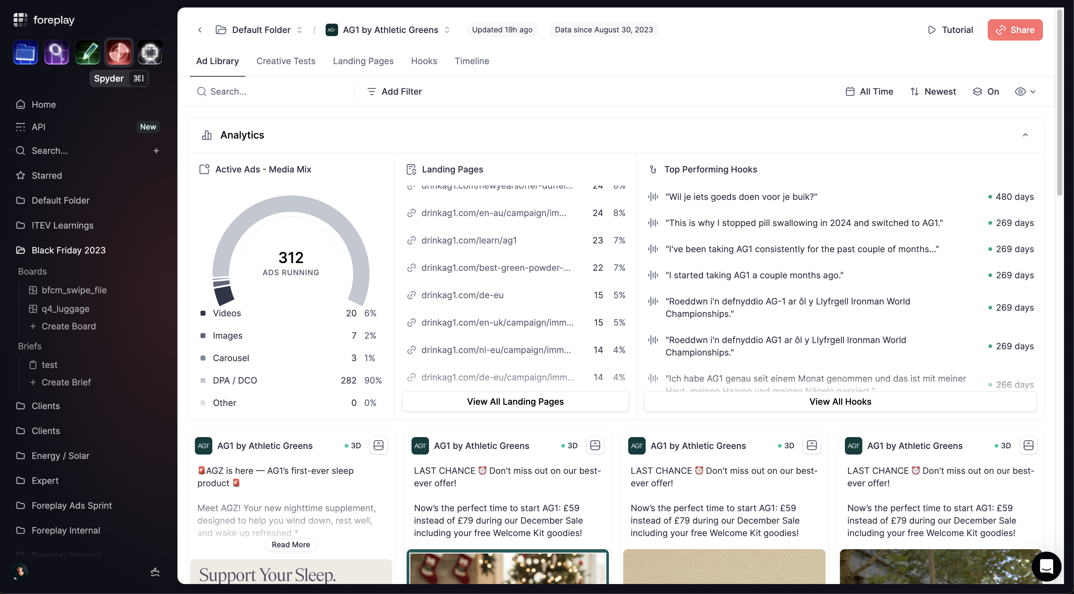 Foreplay goes beyond inspiration with continuous competitor monitoring. Spyder automatically tracks selected brands and surfaces new ads as they launch, giving marketers real-time visibility into competitive strategy shifts, creative testing patterns, and scaling signals, without manual checking of ad libraries.