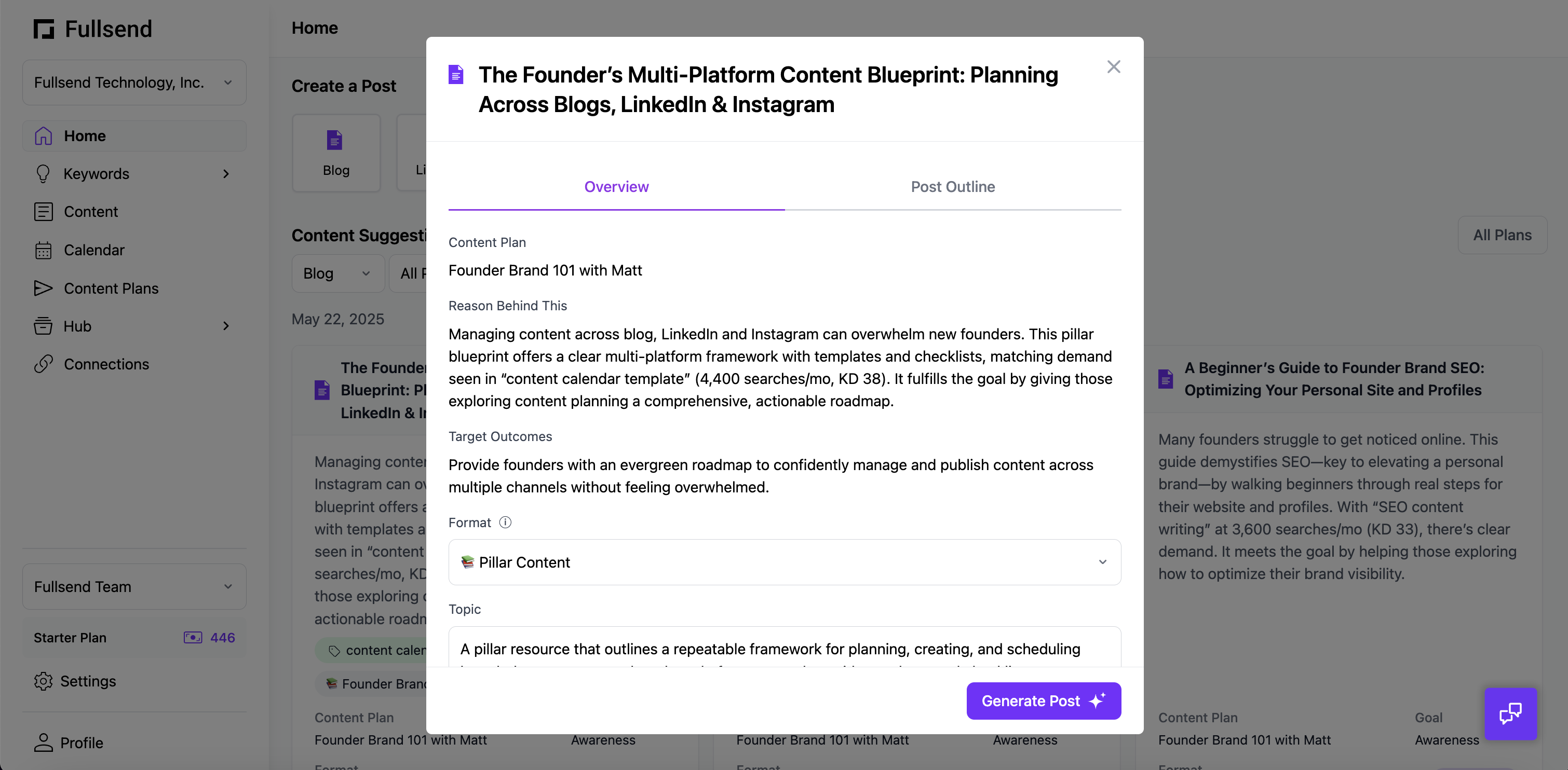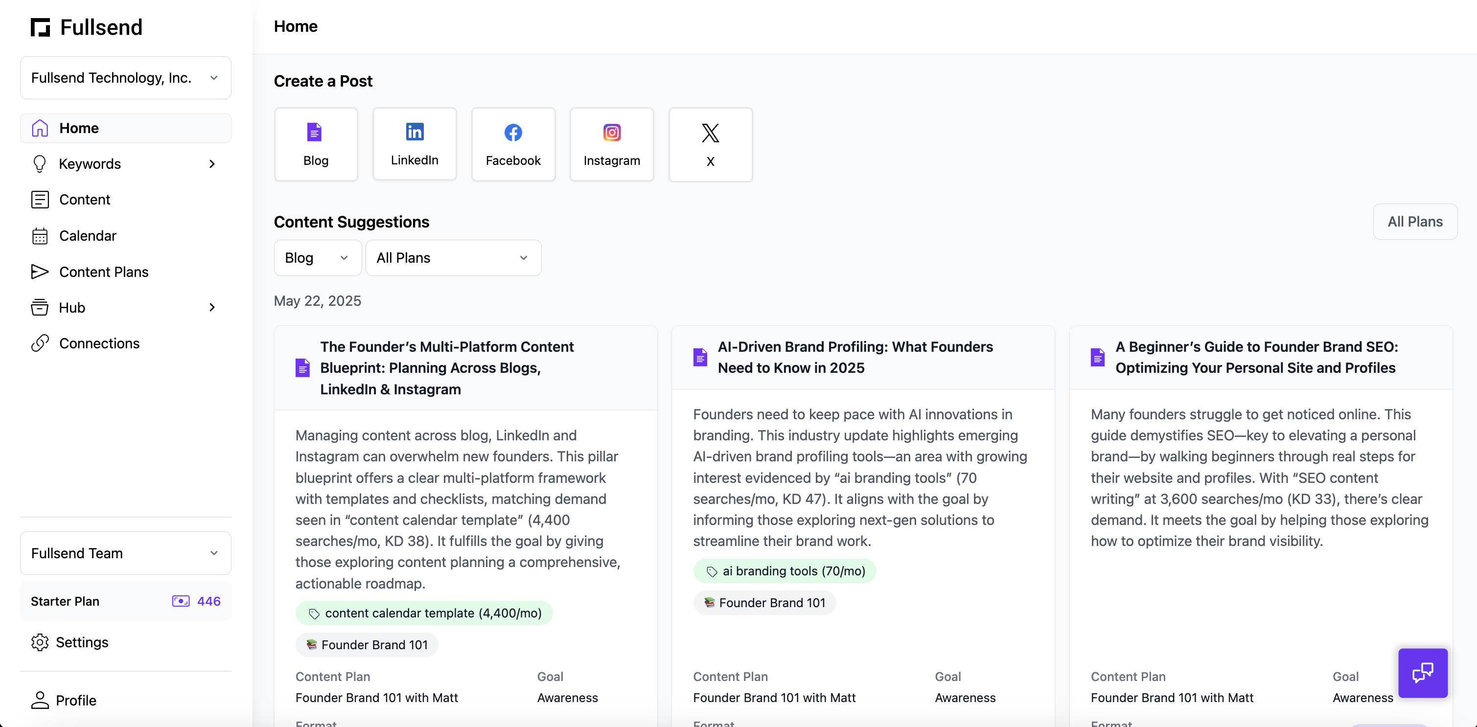 With my innovation consulting company, we first started using Fullsend for our own marketing—and it quickly became a game changer. The AI-powered content creation and strategic planning tools helped us stay consistent and visible online without spending hours every week. What really stood out was how well the content matched our brand voice, thanks to the smart brand profiling. The visual content calendar also made it super easy to keep track of what’s going out and when.
