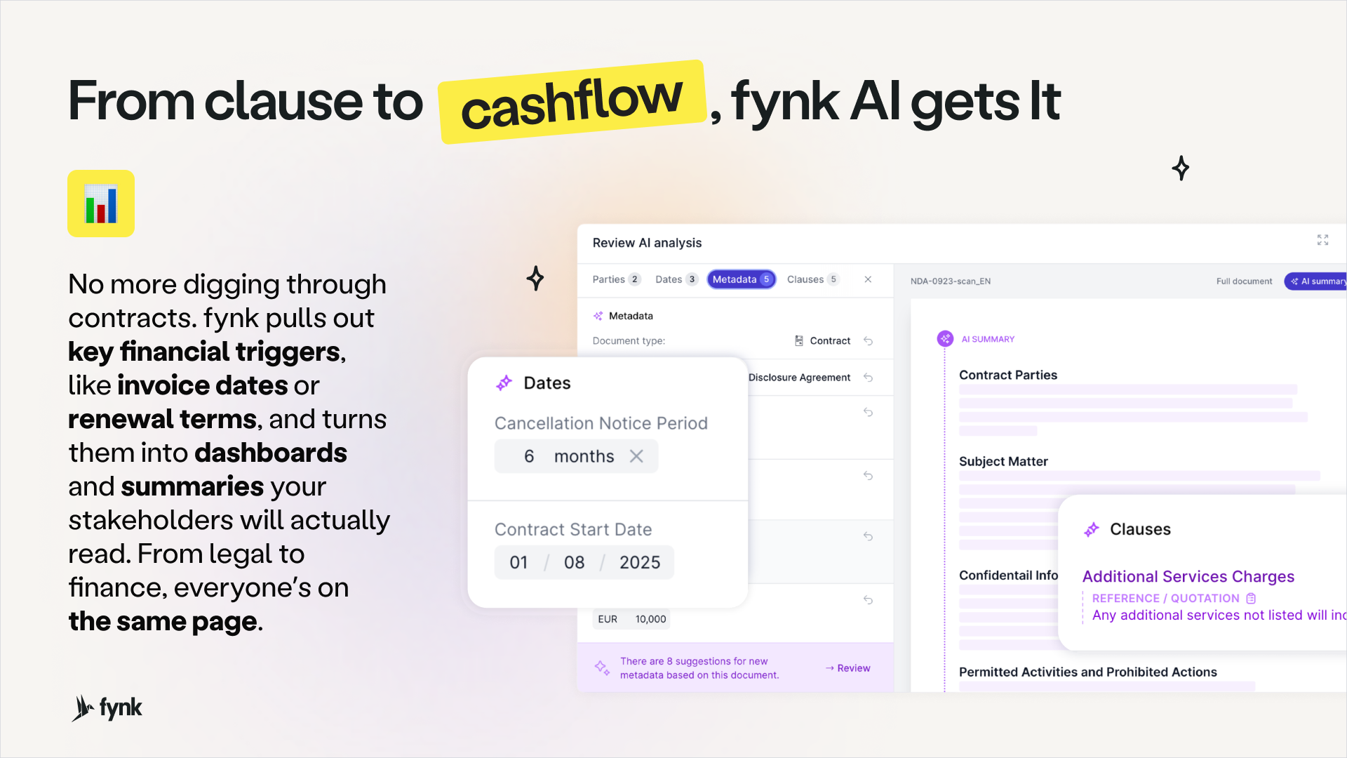 And my favorite is hearing how fynk is our single source of truth. We have on-boarded hundreds of contracts for fabric suppliers, logistics partners and store leases into its centralized repository. AI-driven data extraction is another golden asset for finance: It automatically extracts important provisions such as payment terms, auto-renewal clauses, termination dates and more into structured data fields. This enables me to produce accruals and liability reports that are based on the contract data, not speculative estimates. Integration with our ERP (NetSuite) makes it so we sign contracts, and financial commitment mirrors into the accounting system without journal entry. Review collected by and hosted on G2.com.