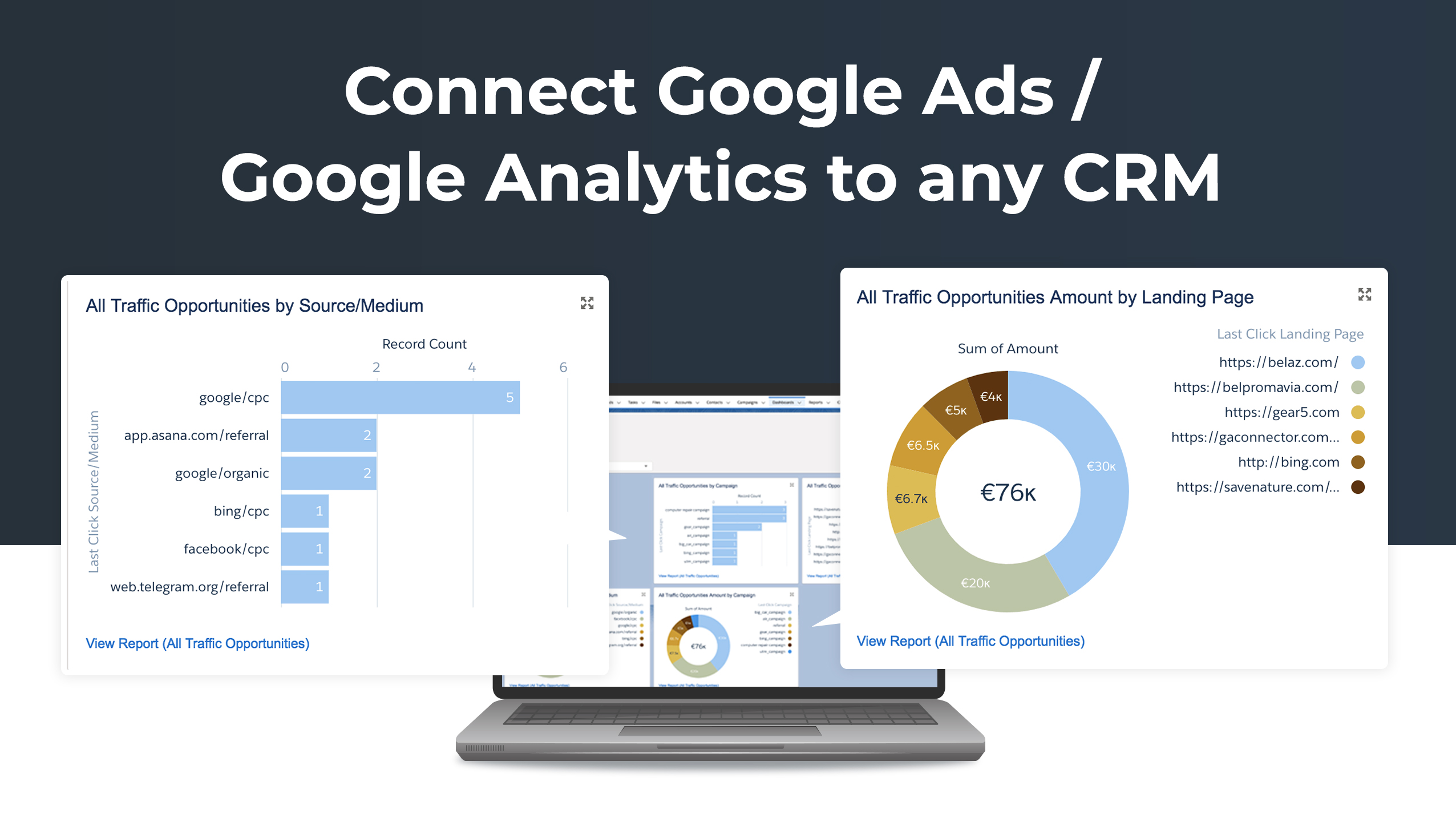 GA Connector integrates Google Analytics and Google Adwords with your CRM (Salesforce, Zoho, Pipeline, etc), to show you - in your CRM - which leads and opportunities actually generate revenue - and which are a waste of your marketing budget.