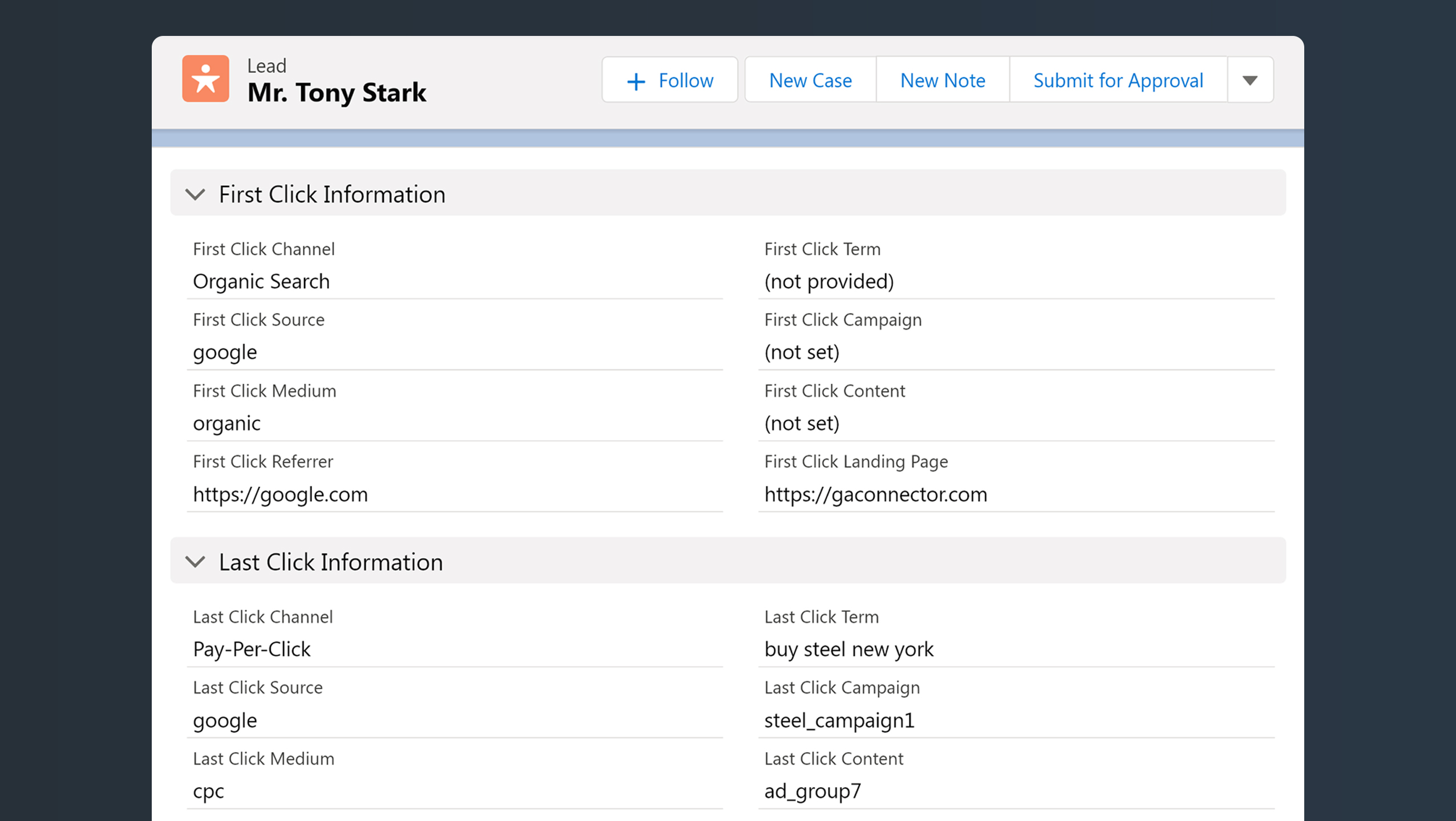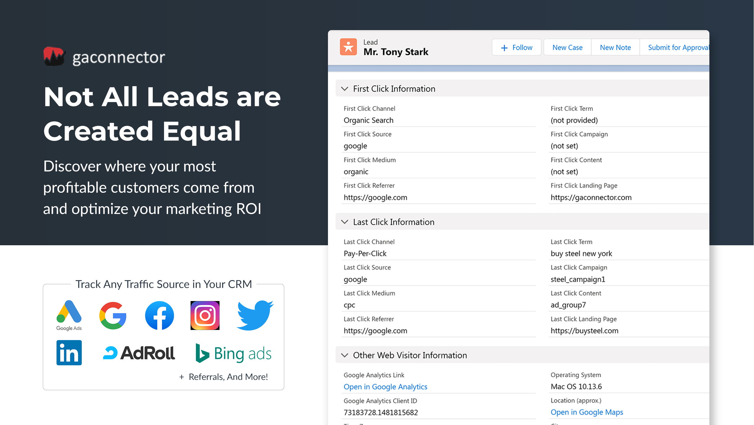 GA Connector is a Google Analytics and CRM integration that provides marketing attribution in Salesforce or your favorite CRM.