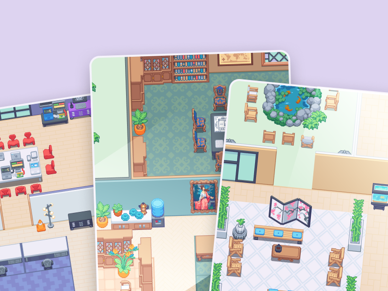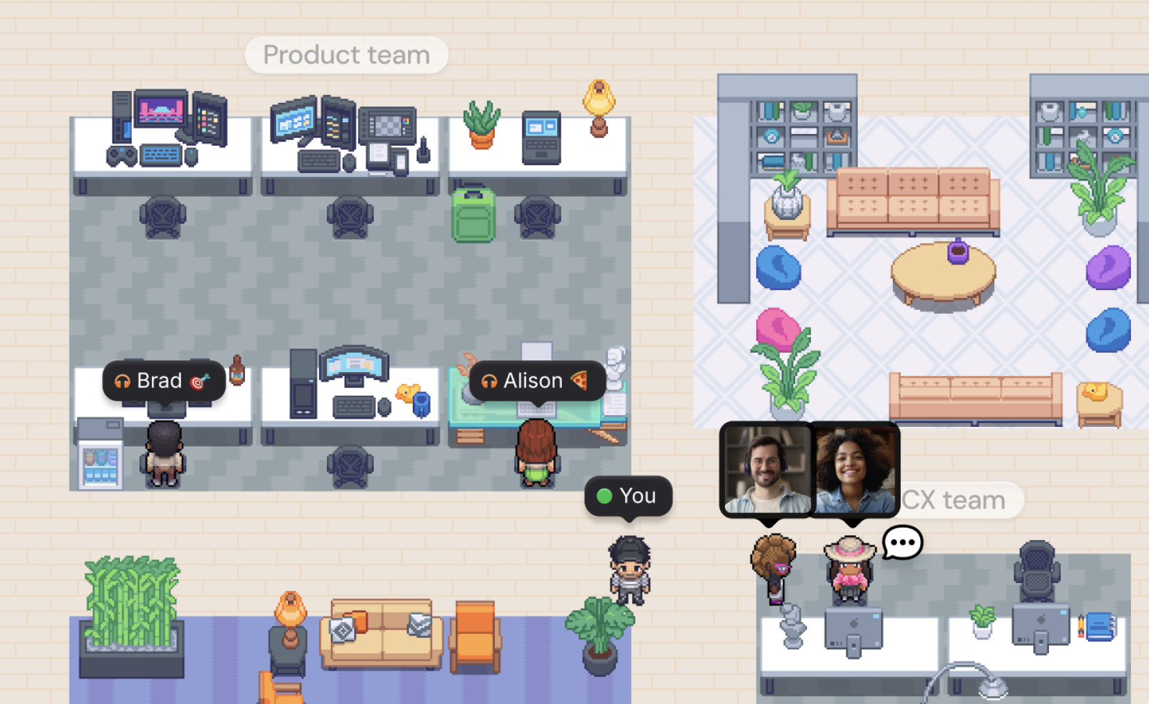 Teams and users can create their own customized rooms/workspaces, offices, lounges, and even event spaces by using the built-in furniture, decor, and other elements (we could add our own elements too in Gather V1, not sure if we have it on V2) to reflect the team/business culture and their own preferences.