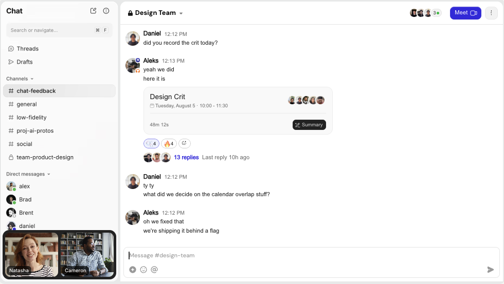 The platform's audio and video system replicates the natural office experience of working side by side, promoting informal convos, teamwork, and stronger relationships that can't be achieved normally day to day when working fully remote. The integrated chat, audio, video, and screensharing capabilities also make it easier to collaborate in a more natural manner without having to juggle multiple services or tools.