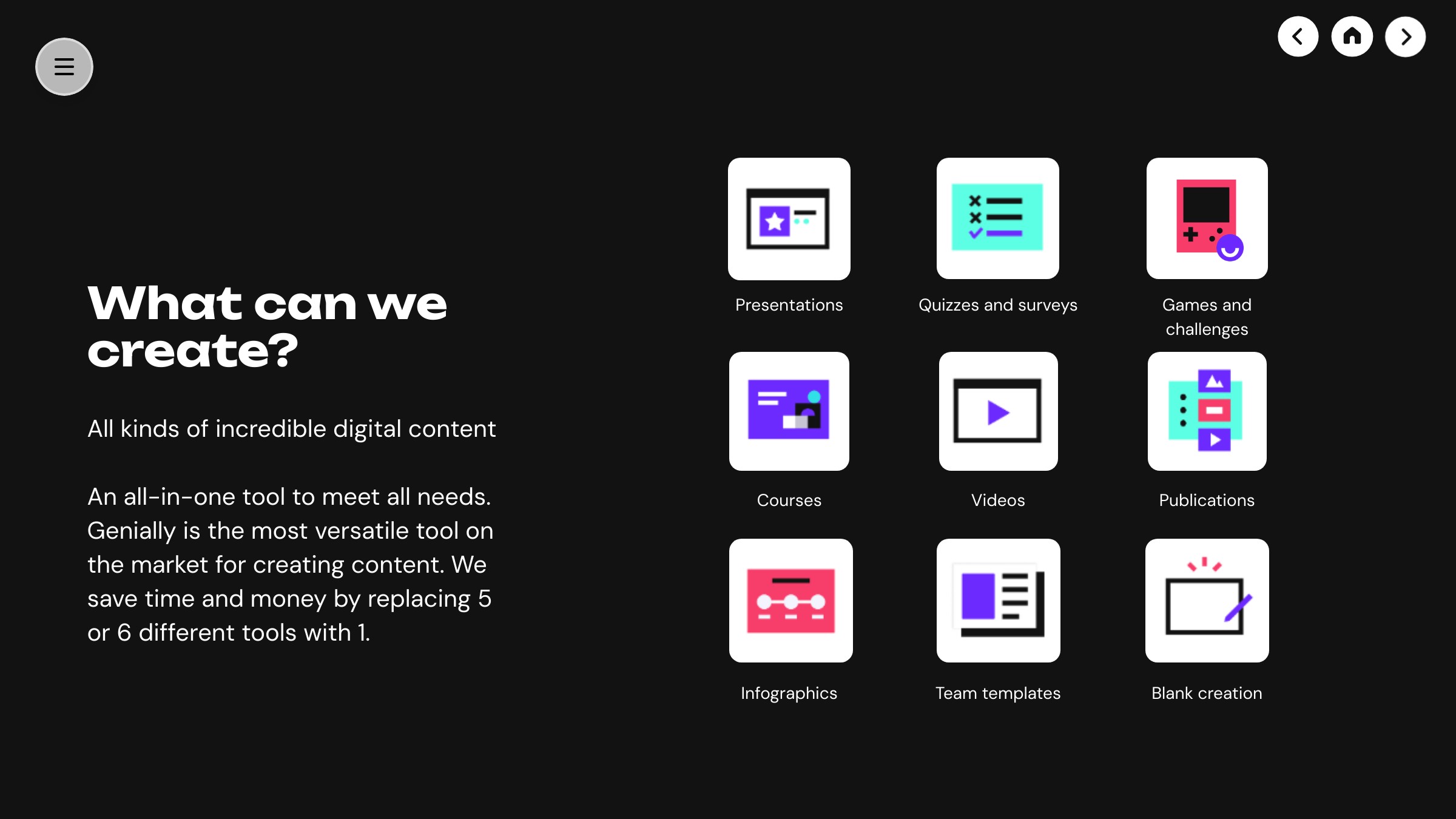 Genially is an all-in-one no-code authoring and content creation platform that enables organizations to transform and design interactive, animated, and visually engaging digital experiences without the need for programming or design expertise.