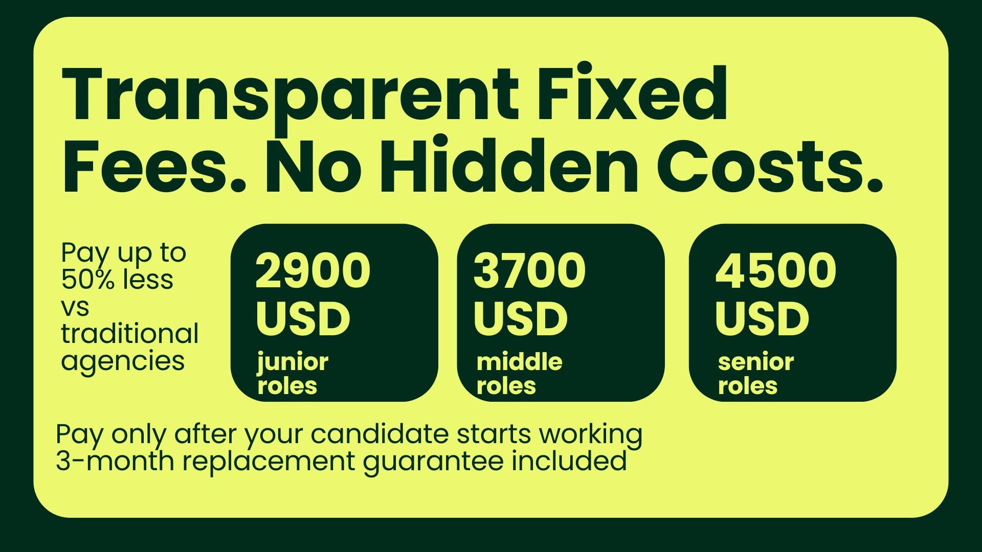 With a fixed-fee model, no upfront payments, and a 3-month replacement guarantee, GENTY makes hiring predictable, transparent, and risk-free. We’ve successfully delivered 100+ placements across software engineering, data, DevOps, sales development, account executives, and customer success — helping clients scale teams in as little as 21 days.