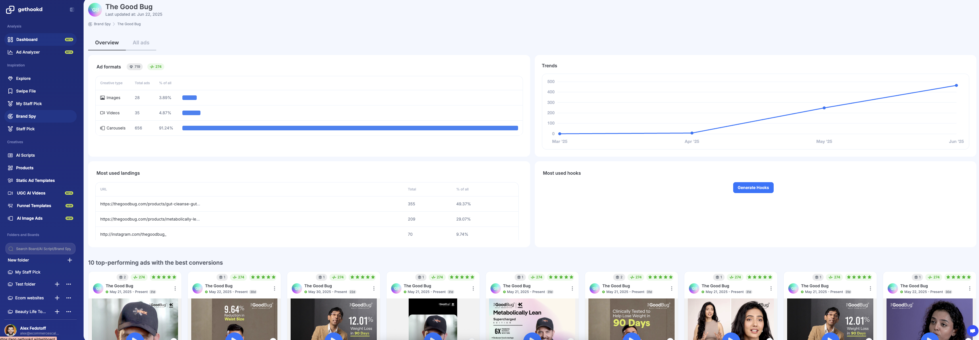 I use Gethookd.AI as a spy tool to improve my eCommerce brand and make more money. It's really good because I can spy on what other brands are doing, see their ads, and find out which brands are scaling quickly. What I like most about Gethookd.AI is how fast it gives me winning insights. I can instantly see which brands are scaling, what creatives they're using, and what's working in the market right now. Instead of guessing, I can mirror proven strategies and adapt them for my own brand. The AI ad generator is insanely useful too. It lets me create high-quality image ads in seconds, so I can test way more creatives without relying on a designer. The speed and visibility combo is what makes it stand out. Besides, it was really easy to set up after signing up because I got a walkthrough of everything. Review collected by and hosted on G2.com.