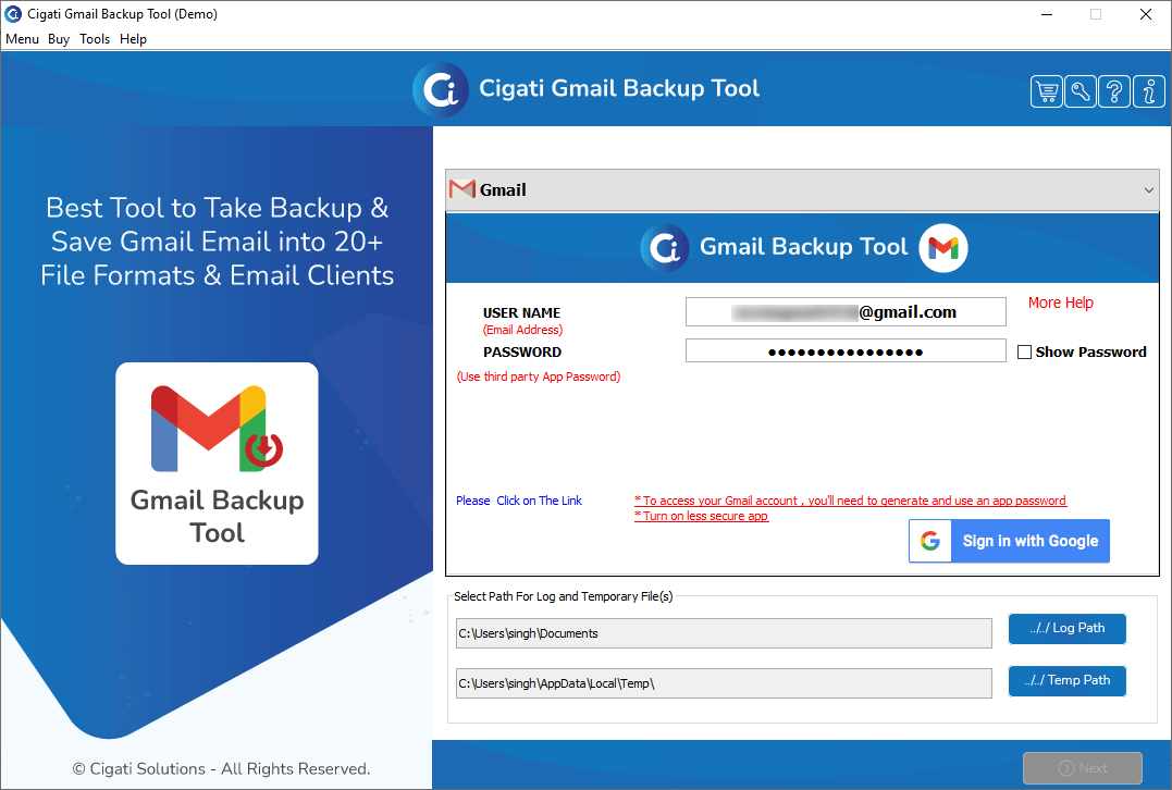 2. After that, enter the login credentials of your Gmail account. Here, you have to use the Third-party app password to backup your Gmail data using this software.
