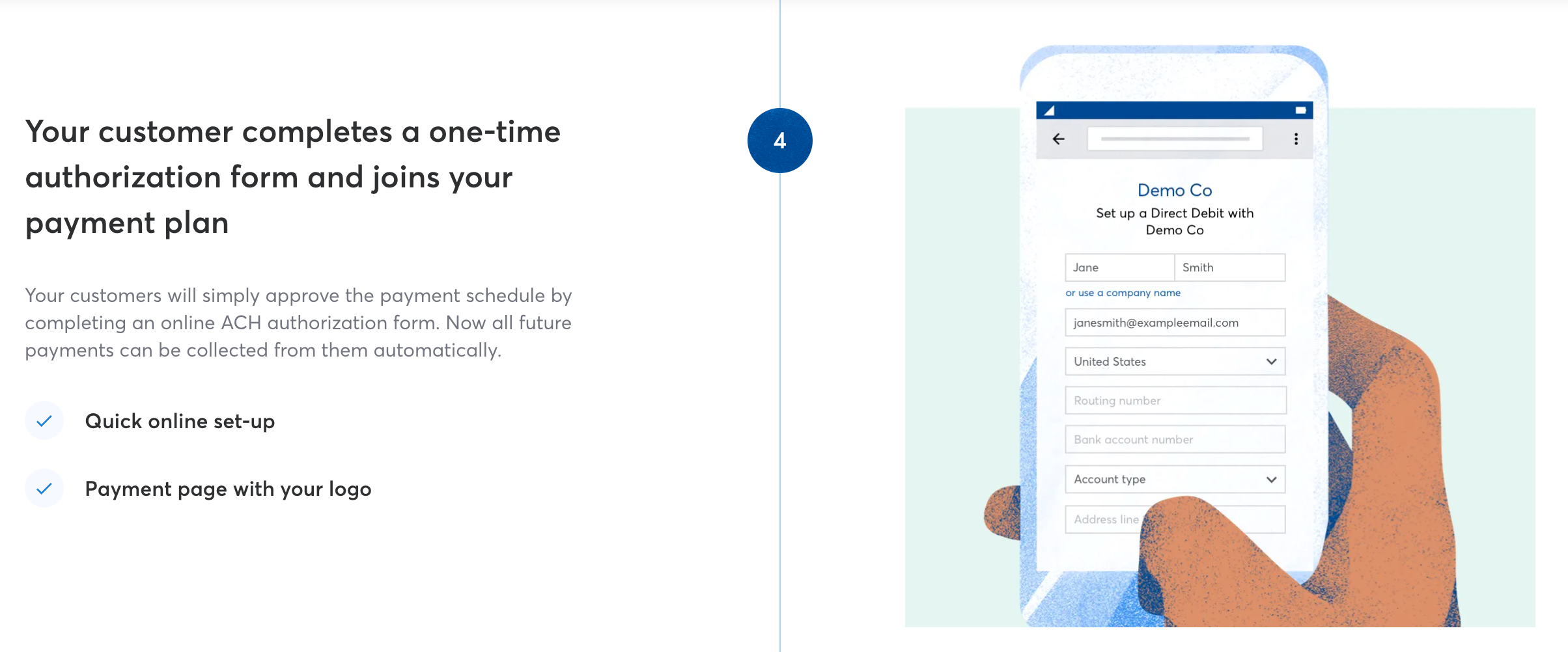 GoCardless is really flexible and easy to use. We can send a customer an email link which after they have filled in a simple form (branded to us) its about 3 minutes to set up recurring payment plans or one off charges.