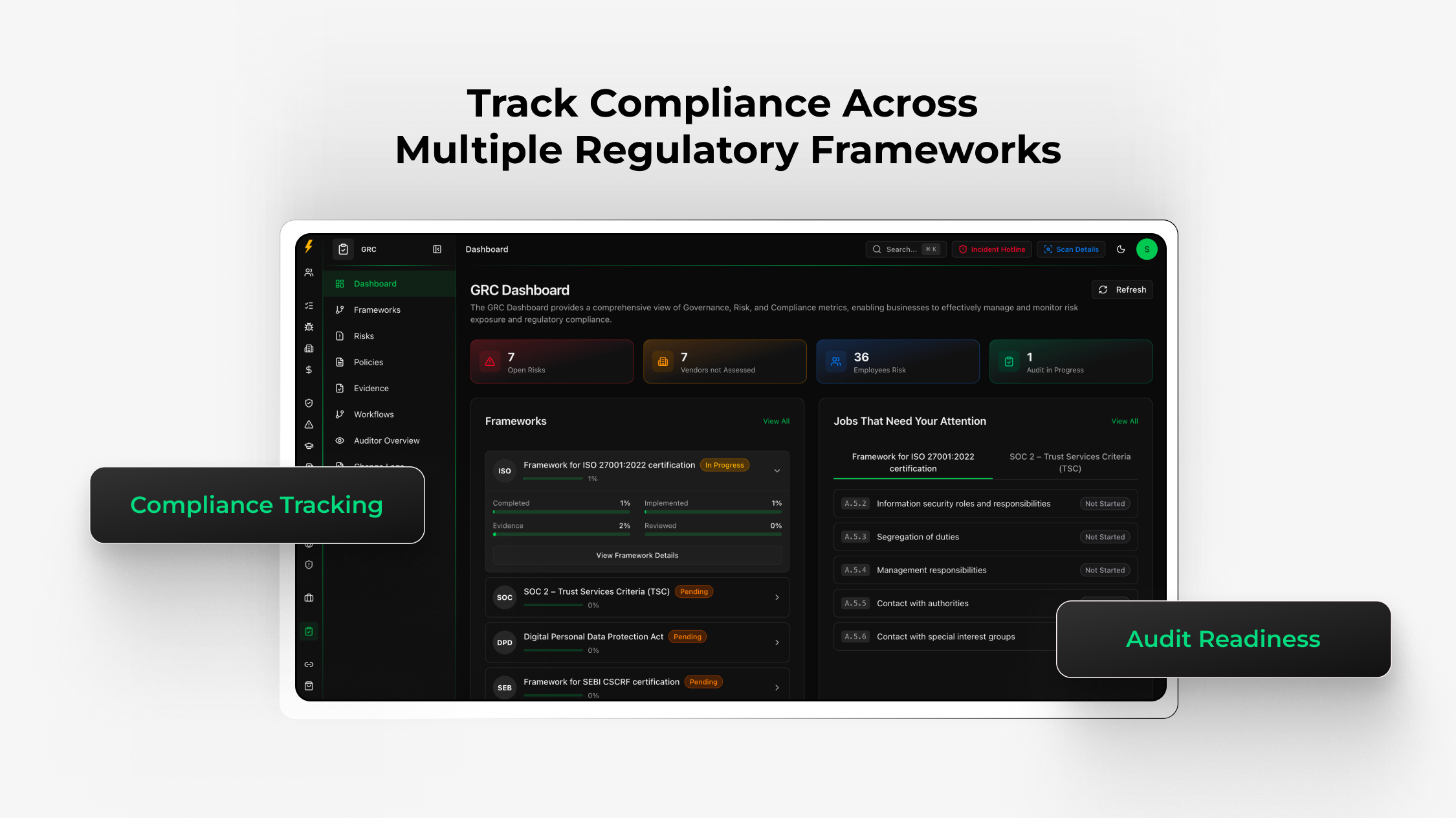 It automates SOC 2, ISO 27001, HIPAA, GDPR,NCA, SAMA,DPTM, PCI DSS, and more, while providing continuous monitoring, risk assessments, and automated evidence collection.