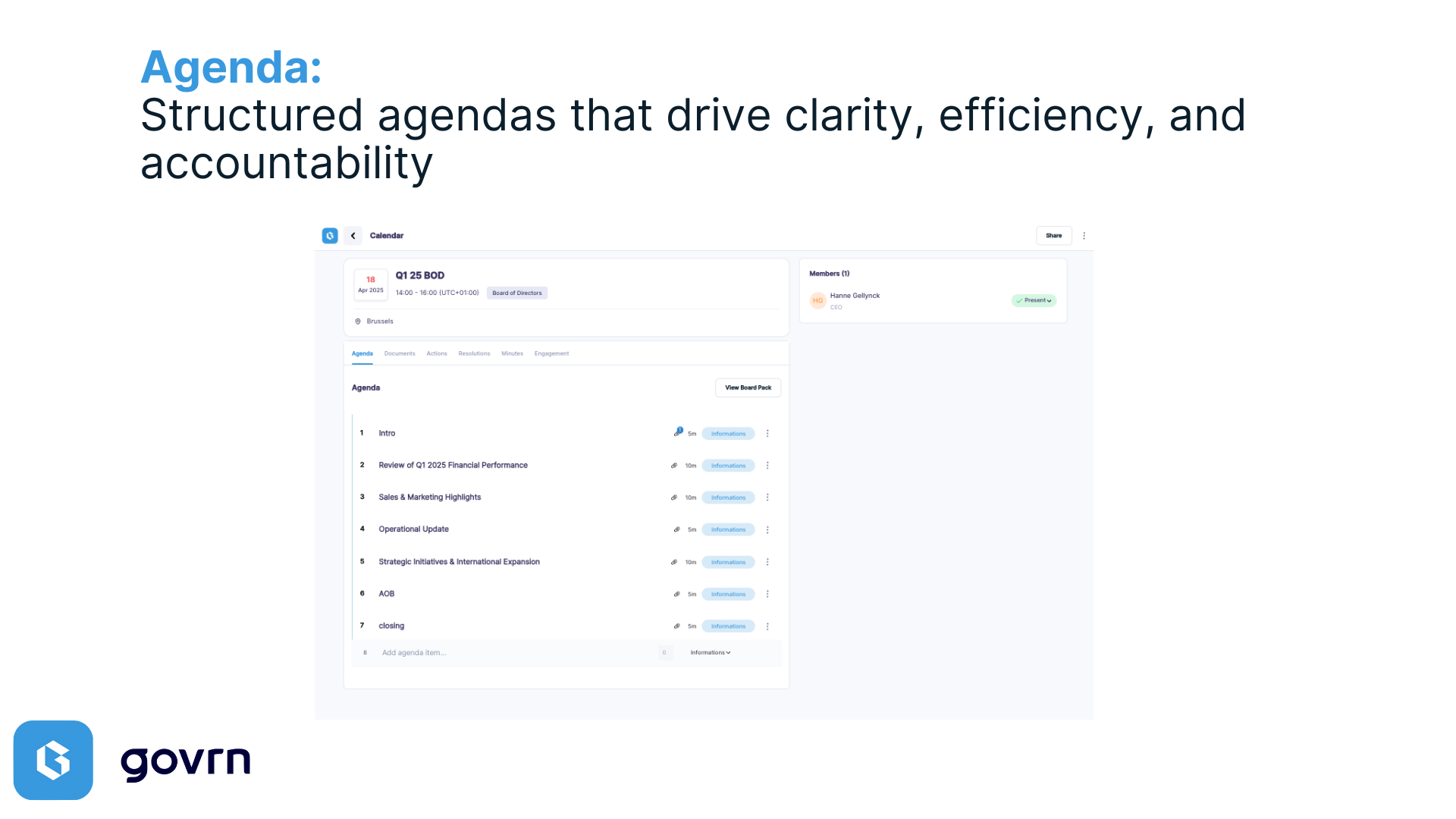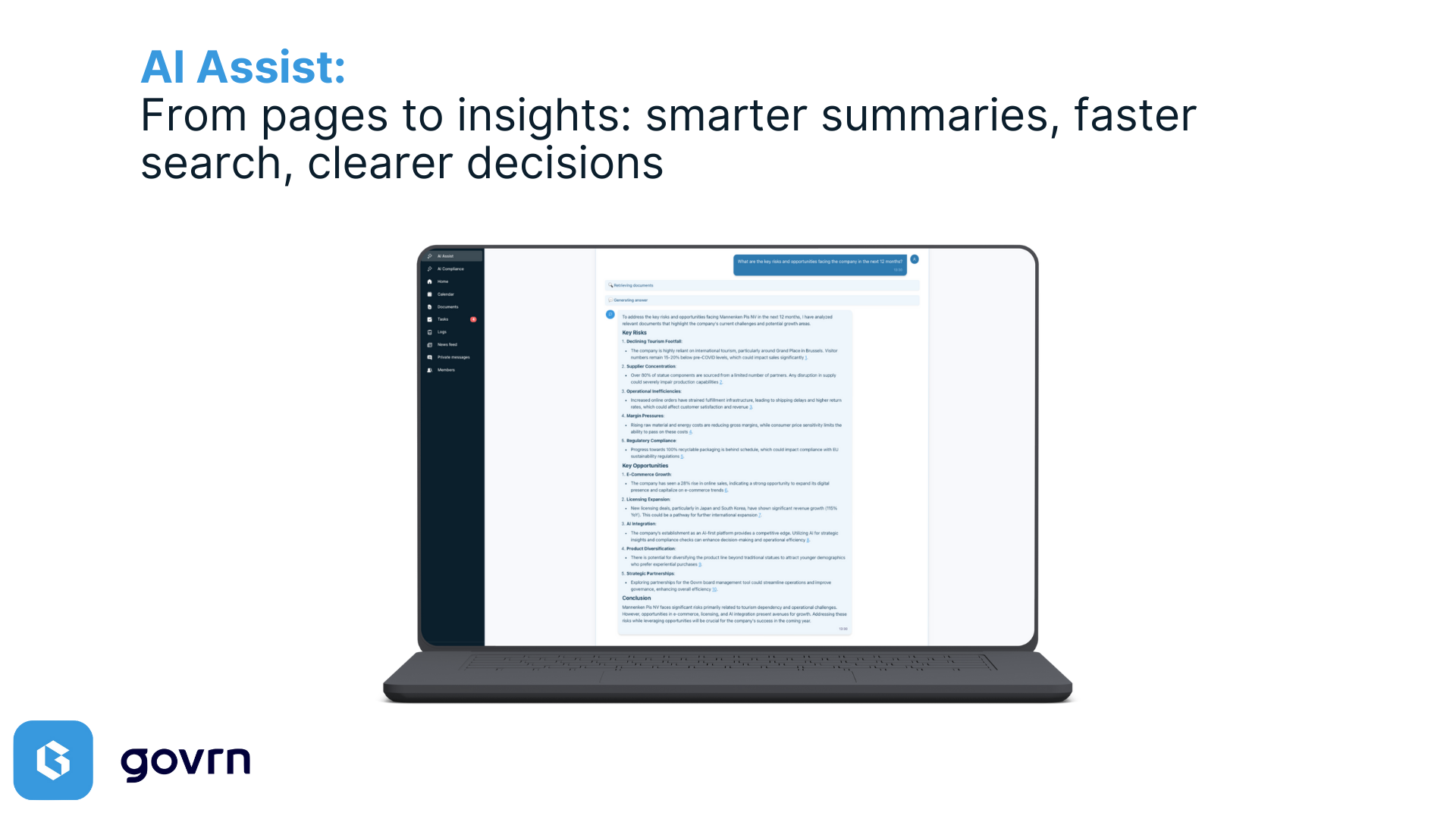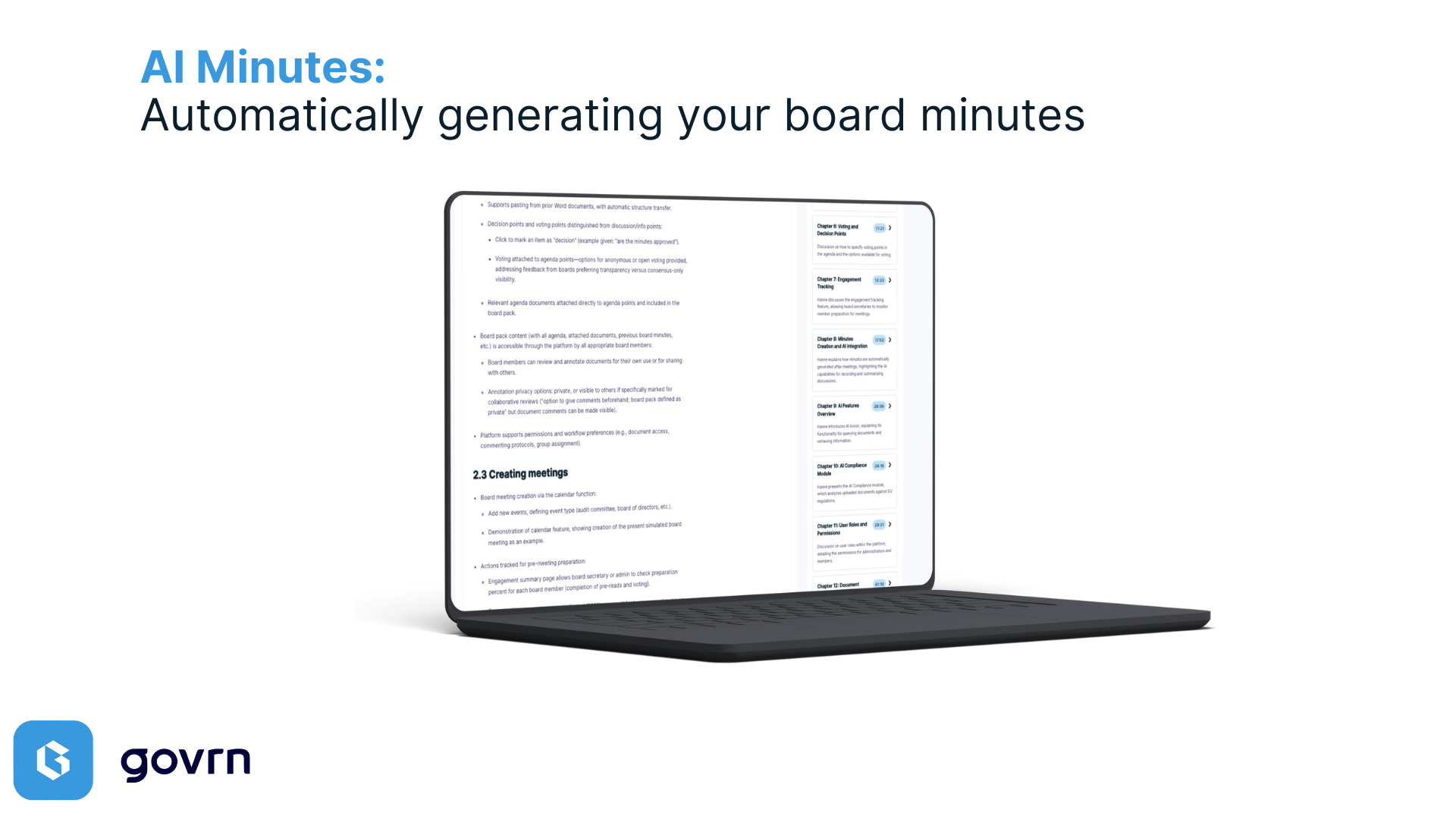 Key features of Govrn include AI-powered insights and automation that significantly enhance productivity. The software automatically generates structured board summaries, meeting notes, and document insights, allowing directors to prepare for meetings more efficiently. This capability not only saves time but also enables boards to engage in more meaningful discussions during meetings. The collaboration with leading university researchers and AI professionals ensures that the insights provided are both relevant and actionable, making it easier for boards to make informed decisions.