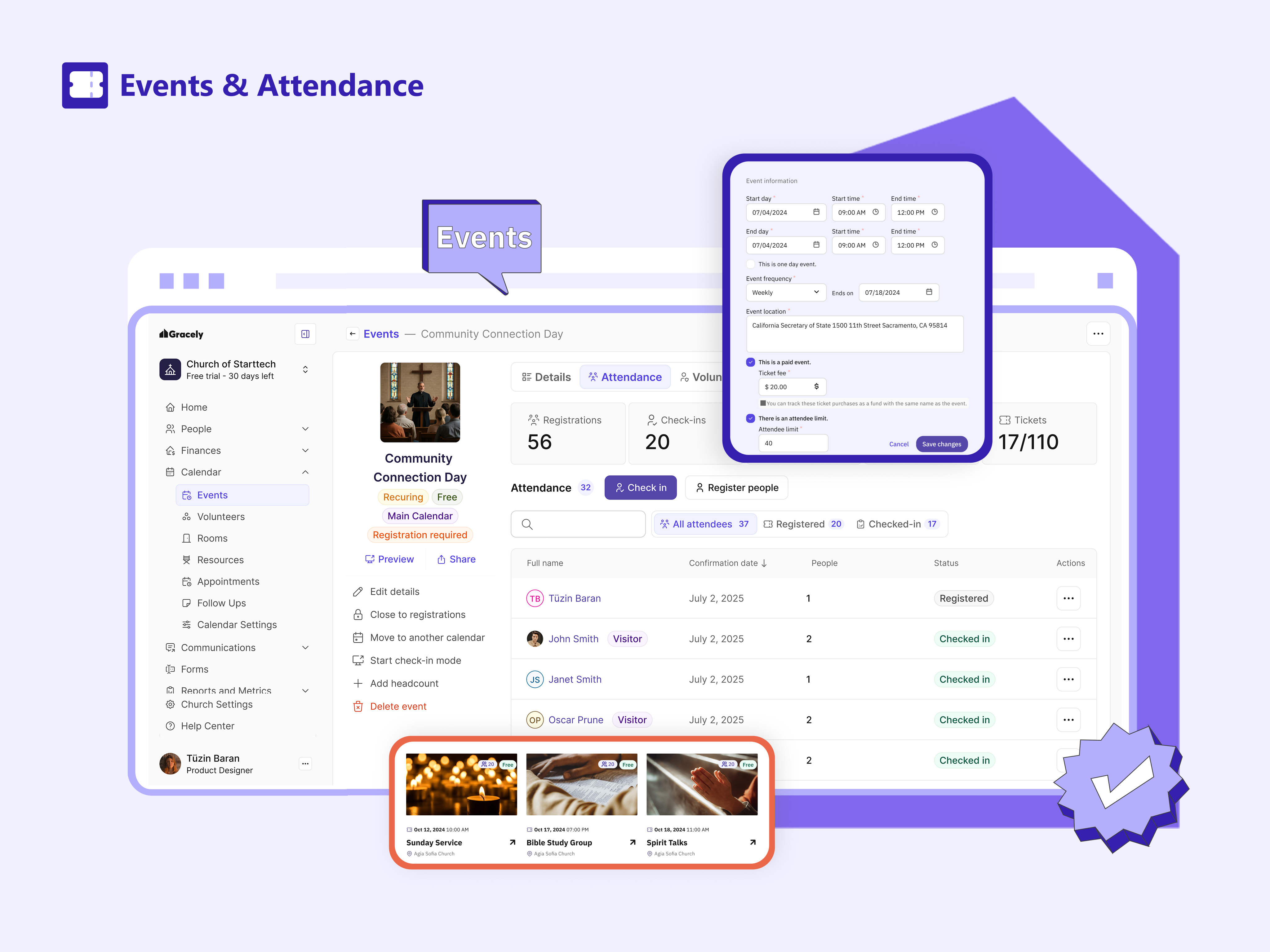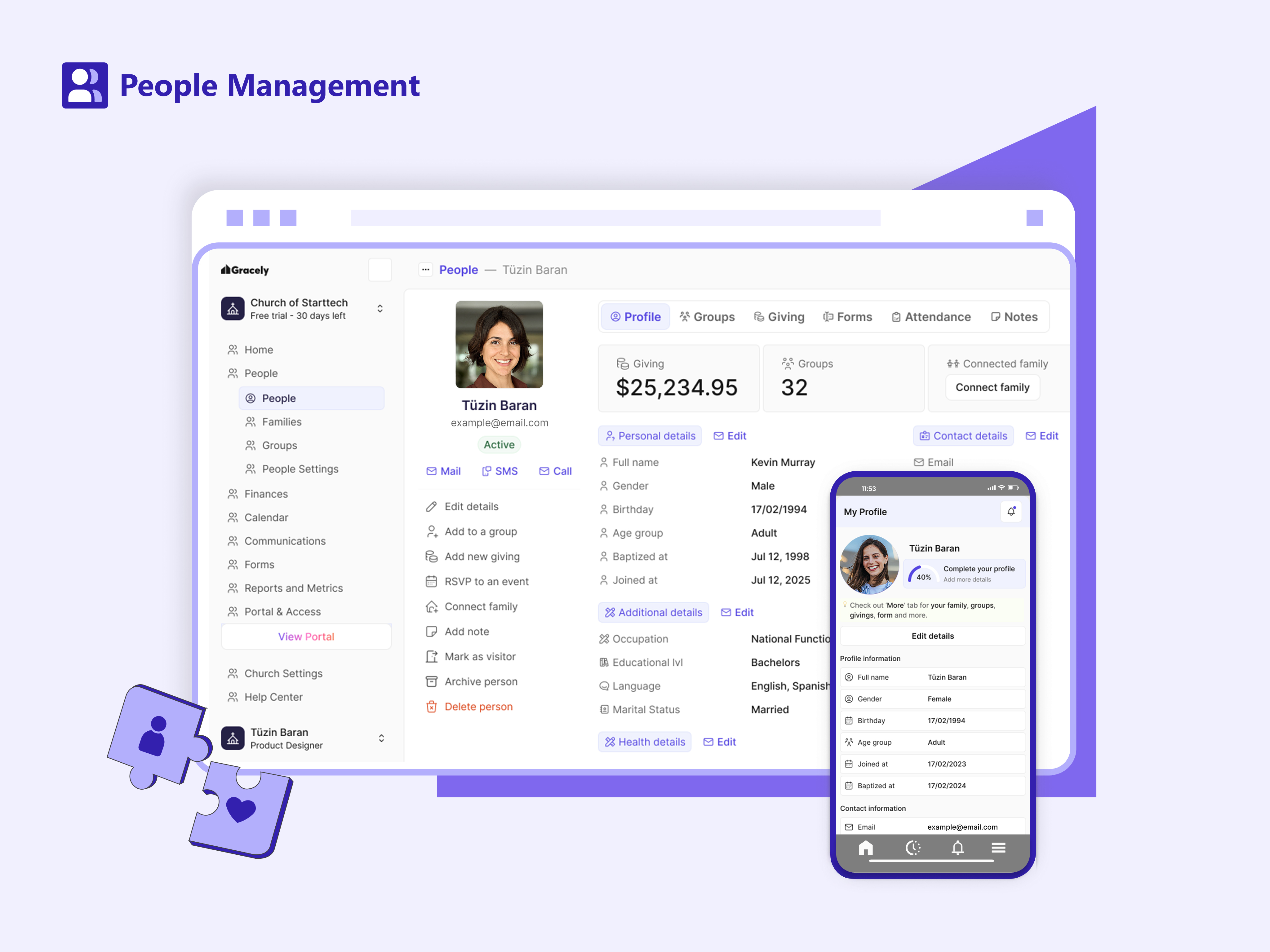 Gracely is a church management software (ChMS) platform that helps churches manage people records, donations, attendance, events, communication, and church operations from a centralized system.