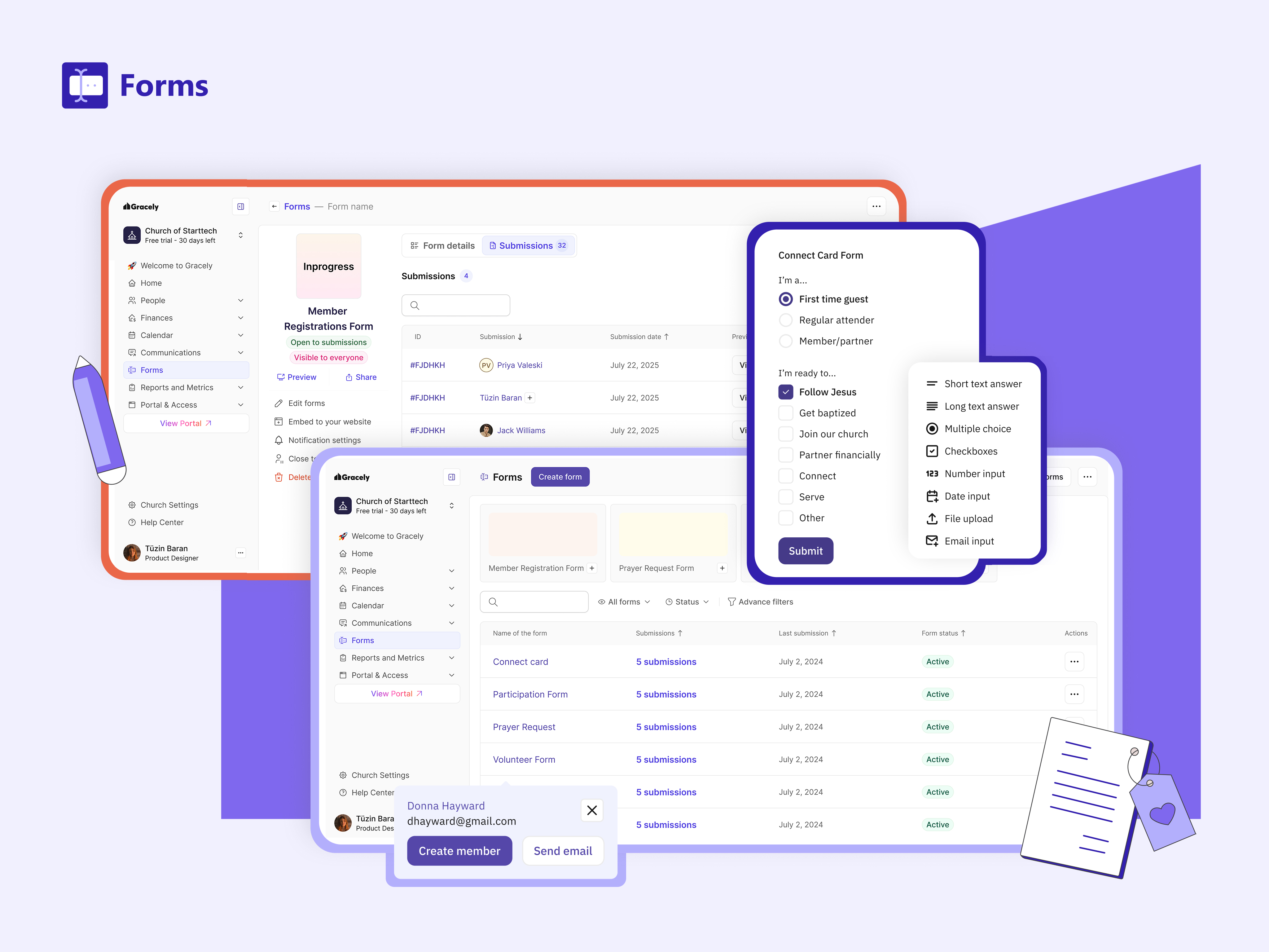Gracely helps reduce reliance on spreadsheets and disconnected tools by keeping people data, participation, events, and communication in one system. It is designed for day-to-day usability by non-technical users and volunteers, with permissions to control access by role.
