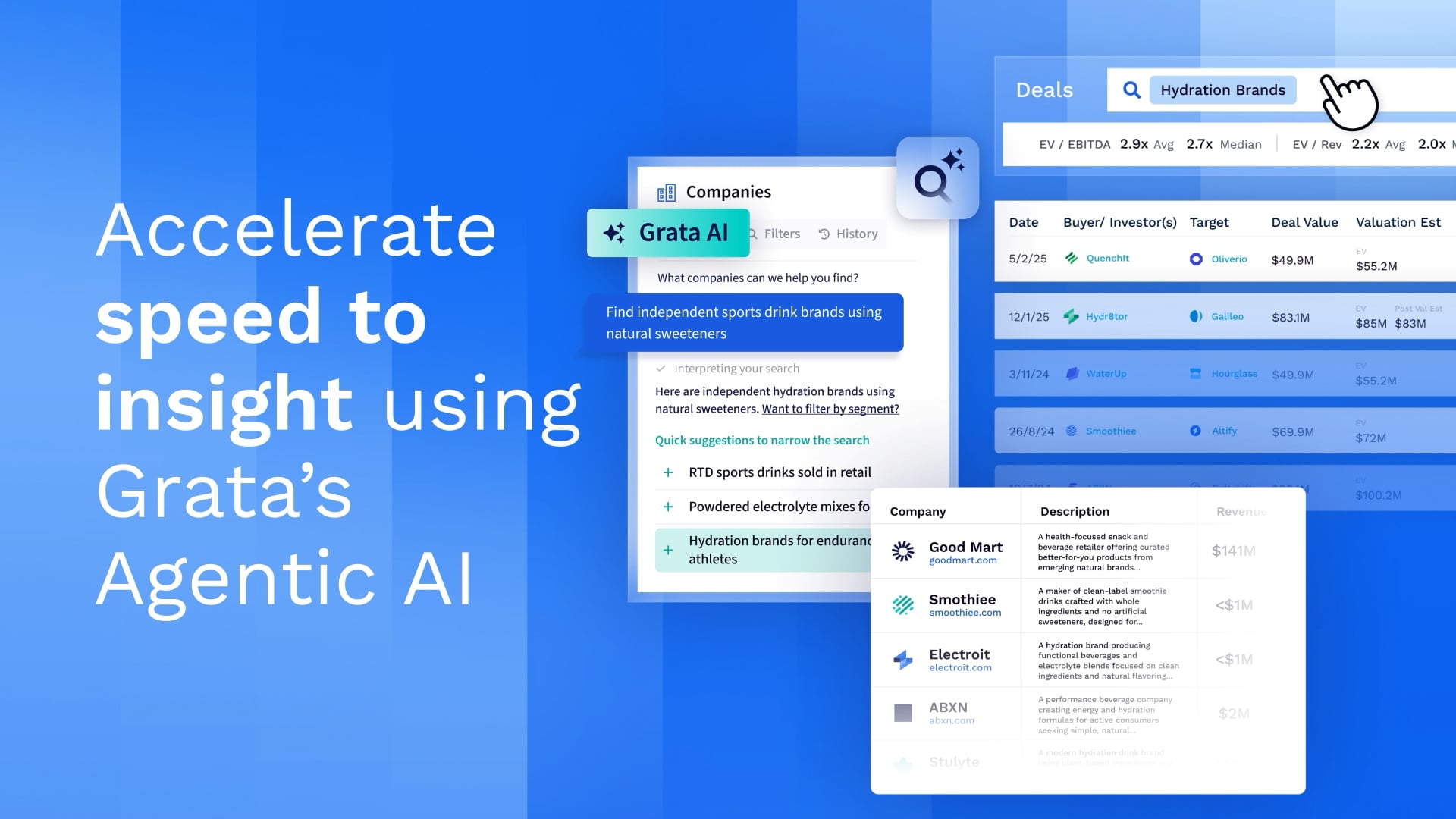 Agentic Search transforms Grata into your AI analyst. It interprets your intent, connects market dots, and discovers opportunities before you even think to filter for them. Instead of returning static matches, it reasons through the problem to surface better outcomes. This makes it easier to uncover off‑market opportunities and identify companies that truly fit your investment mandate.