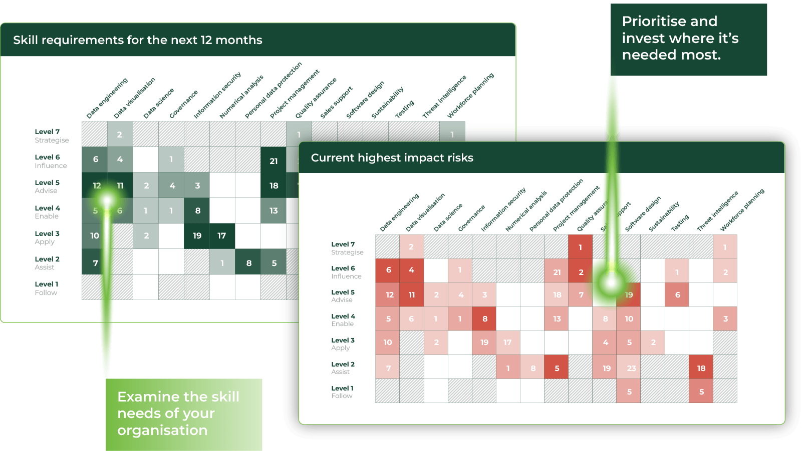 Greenbeam enables organisations to define what “good” looks like in capability terms aligned to their objectives, assess current capability through structured self and manager input supported by evidence, and maintain a shared, auditable view of capability over time. This visibility helps identify where capability is strong, where gaps exist, and where risk may impact delivery. It also supports translating insight into prioritised action across development, redeployment, hiring, and succession.