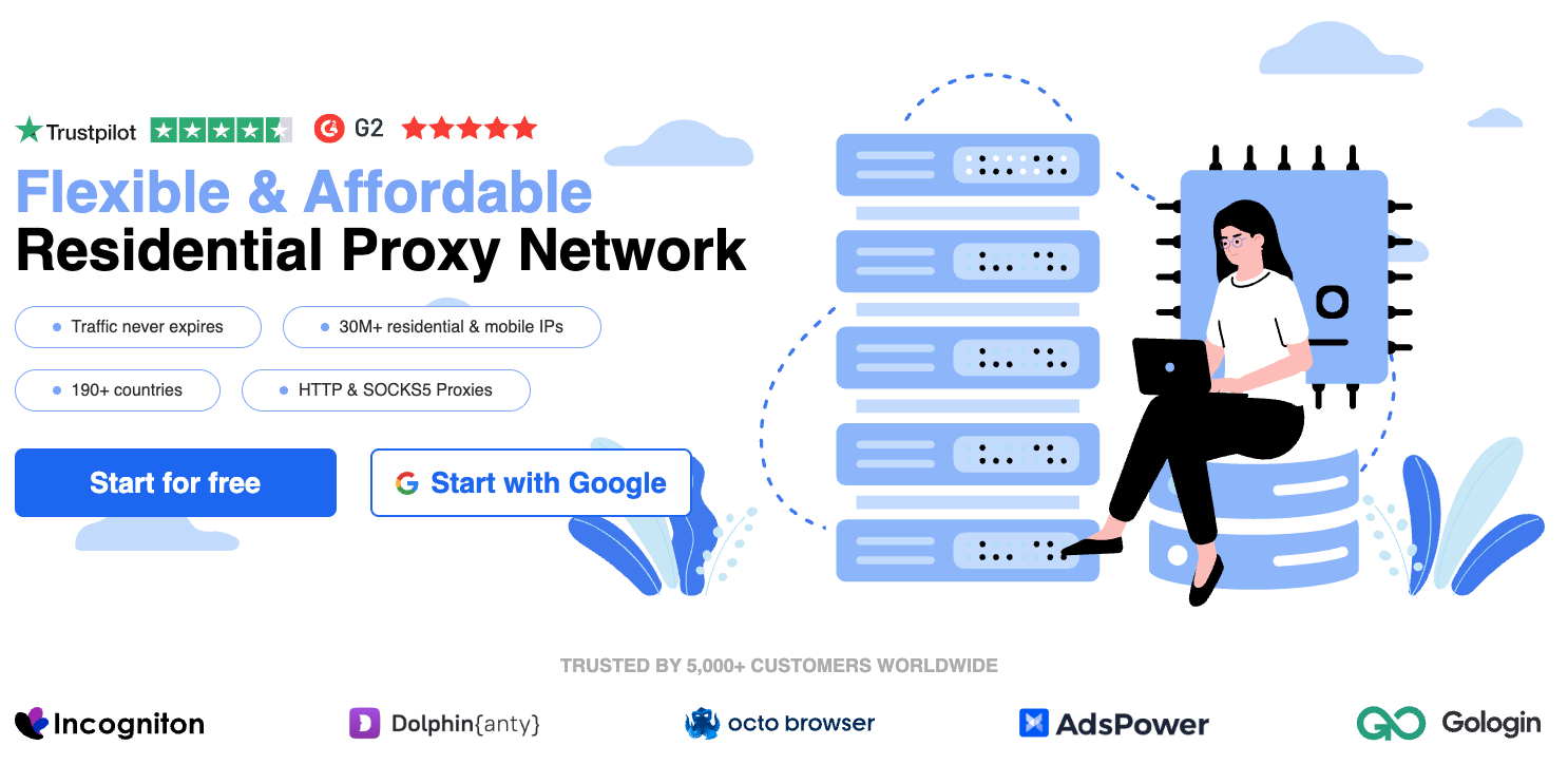 Residential Proxies — 22M+ real IP addresses across 190+ countries. Rotating or sticky sessions. HTTP(S) & SOCKS5 support. Starting from $4/GB.
