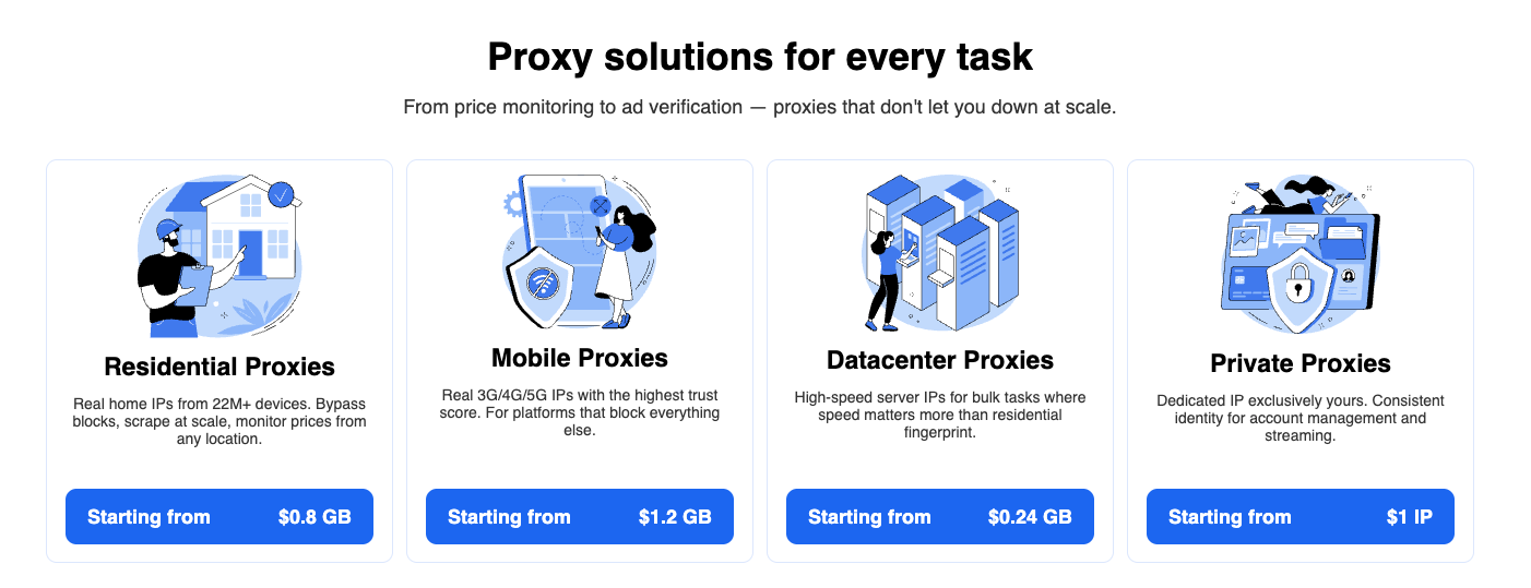 Datacenter Proxies — High-speed IP addresses for tasks where speed matters more than fingerprint. Most affordable option.