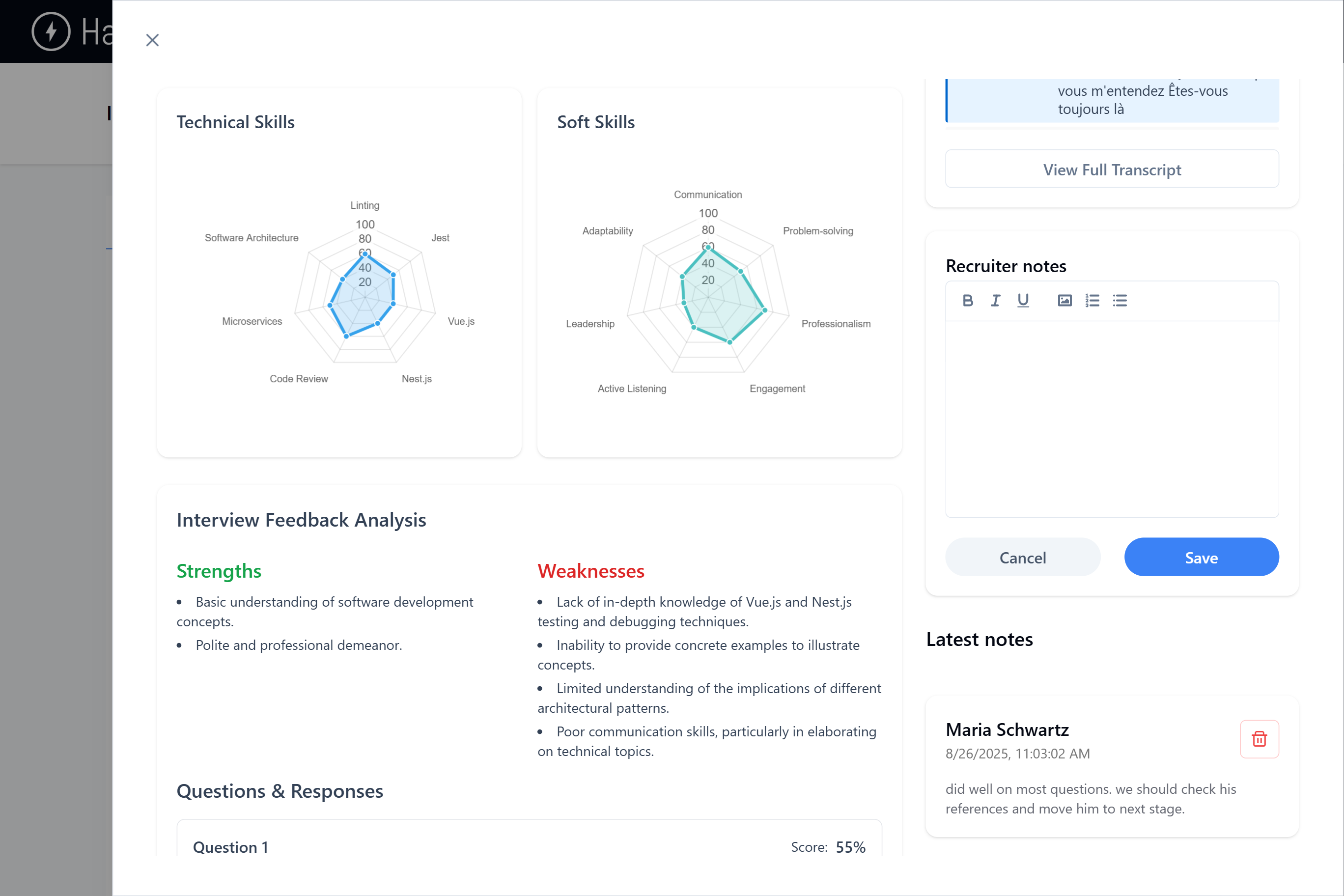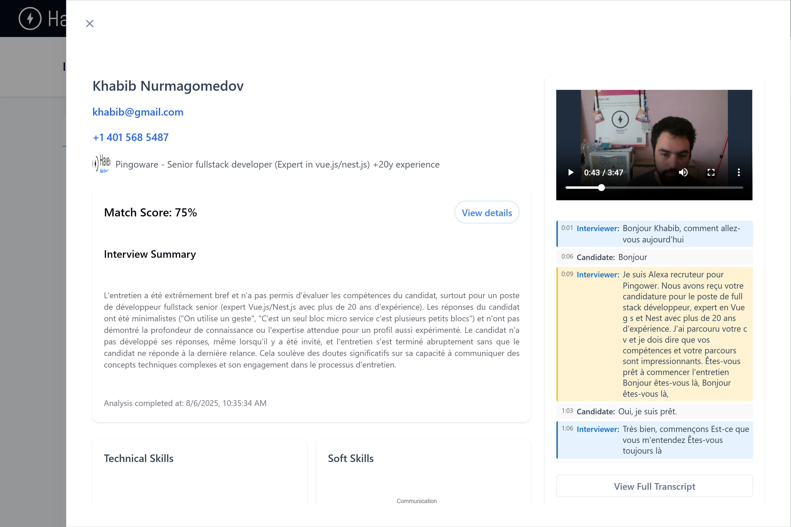 The platform doesn’t stop at resume screening. For candidates who meet your criteria, Haier HR conducts AI-driven virtual interviews with a lifelike digital interviewer. These structured interviews assess both technical and soft skills, ensuring that employers gain a complete picture of each applicant. Following the interview, Haier HR generates a detailed evaluation report, including competency insights, personality traits, and spider charts of skills.
