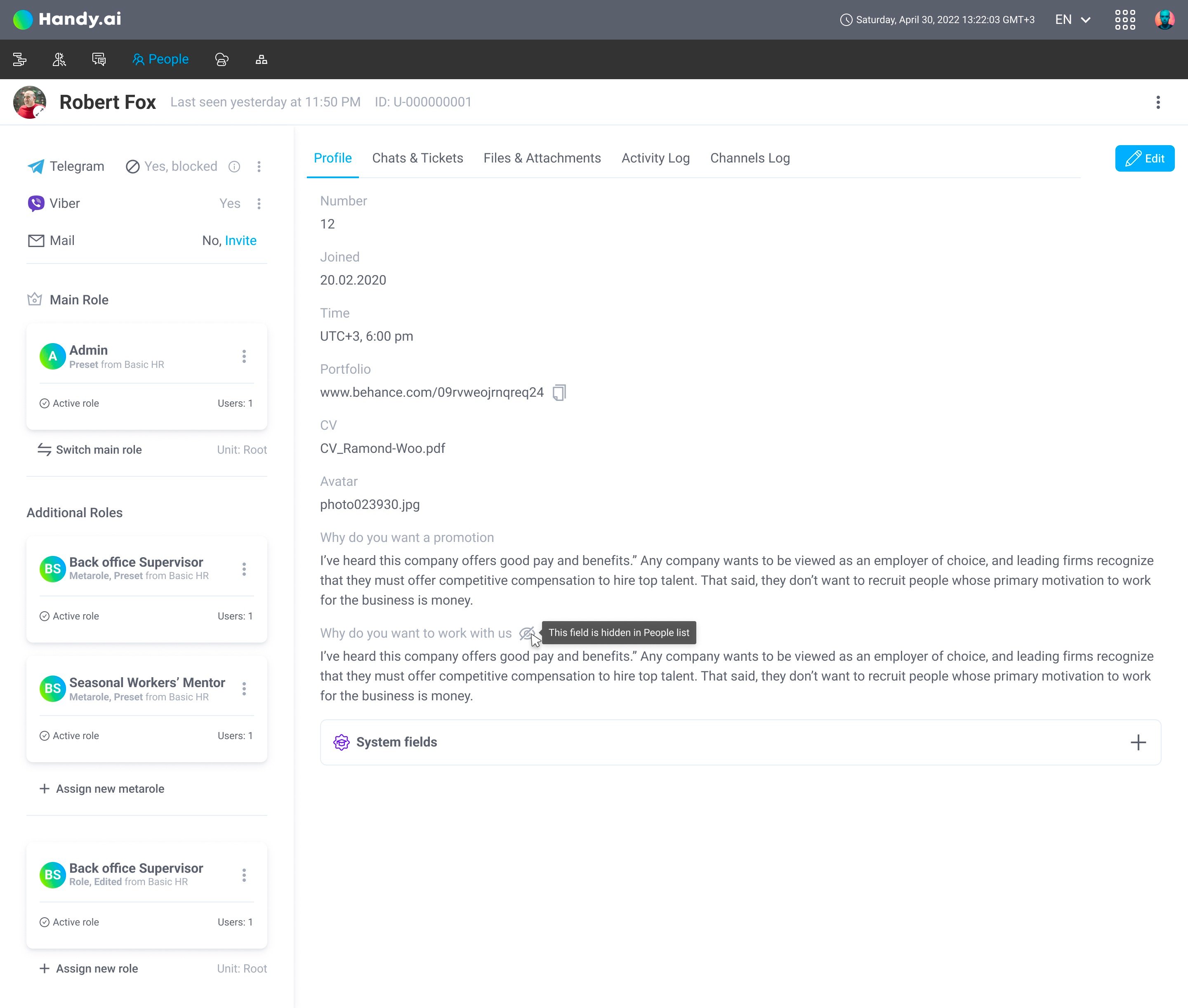 Rich user profile menu with all information: roles, contacts, access, documents and etc.