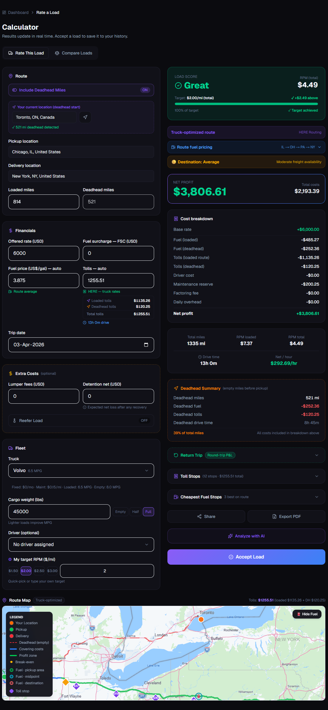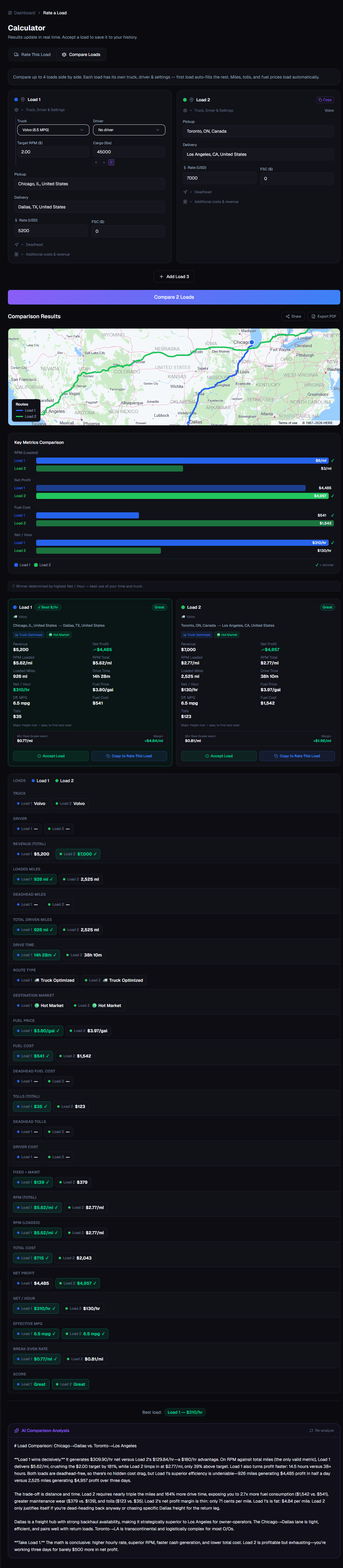 At its core, Haulalytics is a powerful load profitability calculator. Drivers enter their pickup and delivery locations, the offered rate, and basic truck specifications — and within seconds receive a complete financial breakdown including revenue per mile (RPM), total fuel costs, toll estimates, deadhead (empty) miles, and net profit. Key features include side-by-side load comparison, allowing drivers to evaluate two loads head-to-head and choose the more profitable option. The platform uses live regional diesel prices powered by the U.S. Energy Information Administration (EIA) and Natural Resources Canada (NRCan), ensuring fuel cost estimates are always current and accurate. Haulalytics supports both US and Canadian routes with automatic USD/CAD currency detection for seamless cross-border calculations. Truck-accurate route mapping provides a visual display of each trip, including truck-specific routing, toll calculations, and nearby fuel station search. Drivers can also export their calculations to CSV or generate shareable links to collaborate with dispatch teams and business partners. Additionally, Haulalytics features an educational blog offering practical guides on cost per mile, load profitability strategies, and freight business best practices. The platform is available as a free plan to get started, with a paid plan that unlocks advanced features and tools designed for professional drivers and growing fleets.
