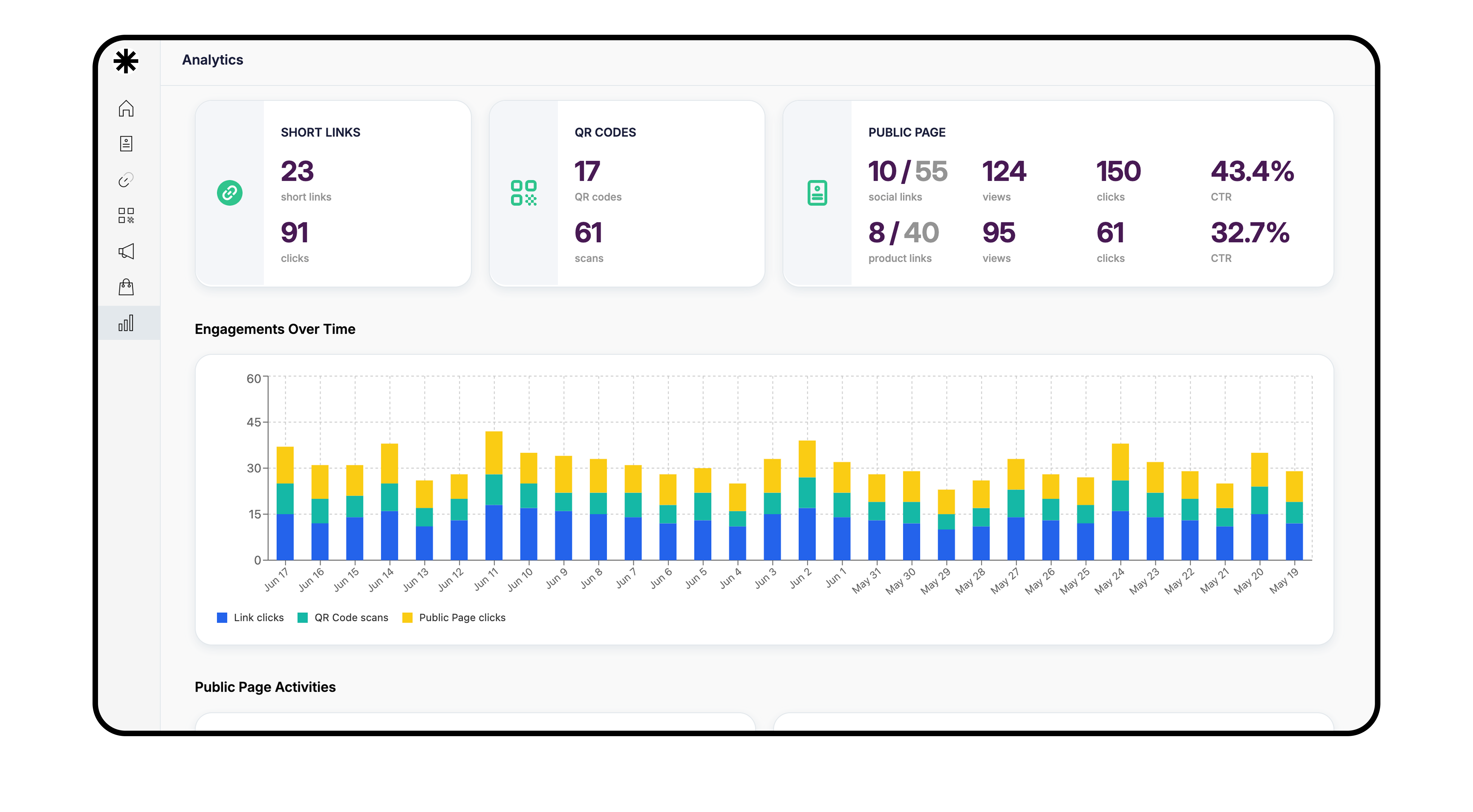 Key benefits include: streamlined link and campaign management, branded public pages, QR code generation, real-time performance analytics, product sales, and audience engagement — all from a centralized dashboard.