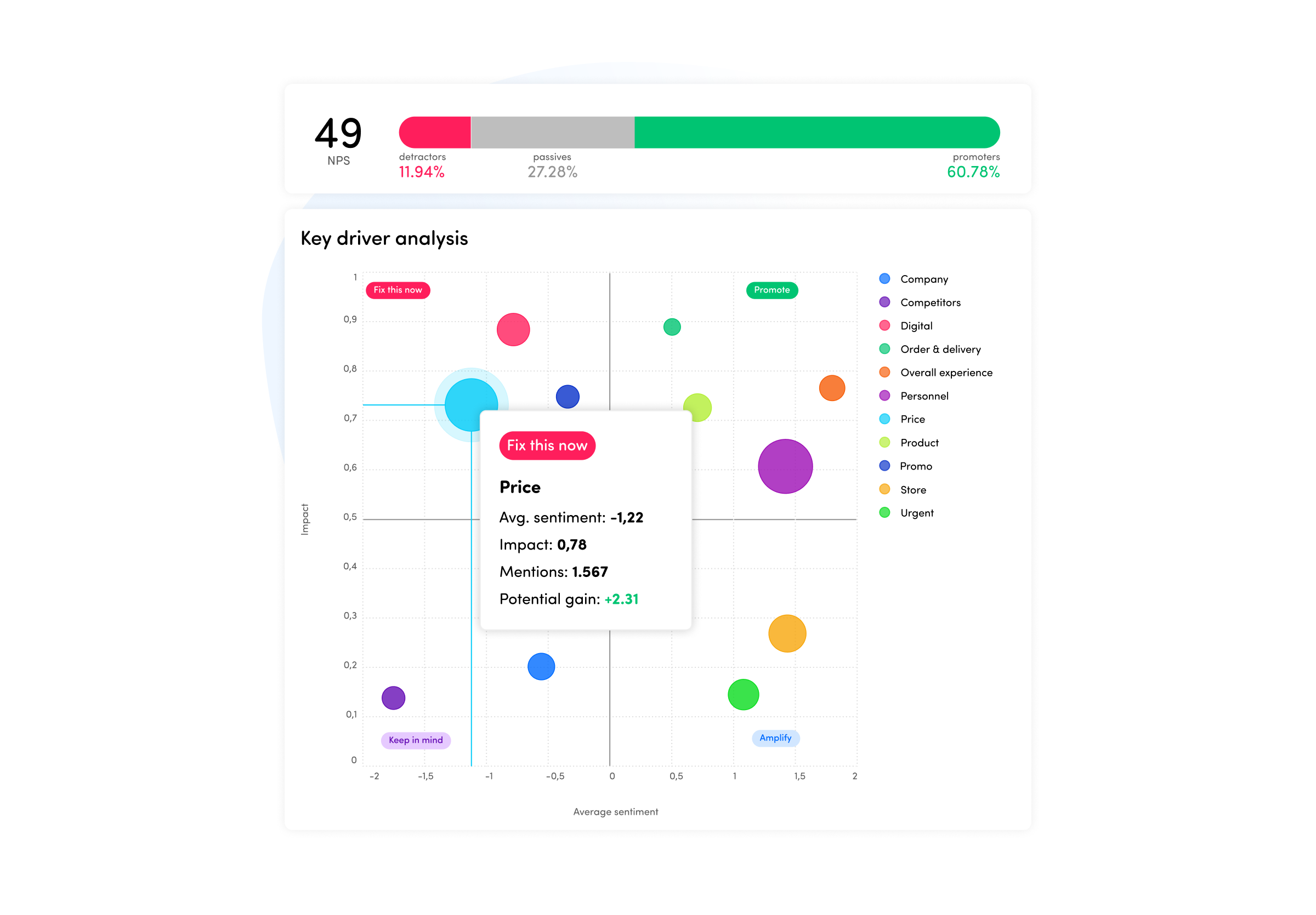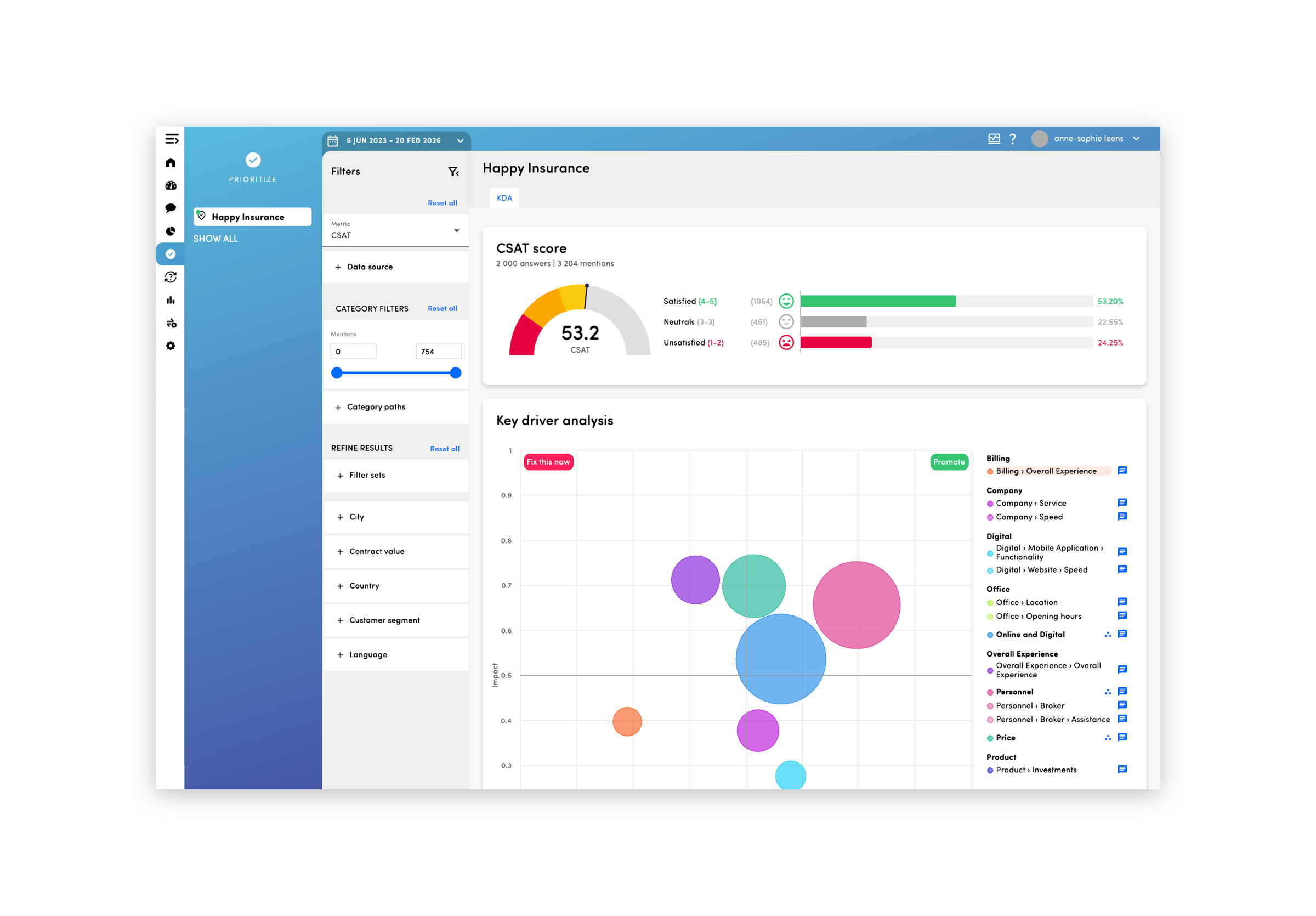 Key Driver Analysis reveals which topics have the greatest impact on CX metrics like NPS or CSAT. By combining sentiment, volume, and impact, the dashboard shows which areas to fix immediately, promote as strengths, or monitor for future opportunities.
