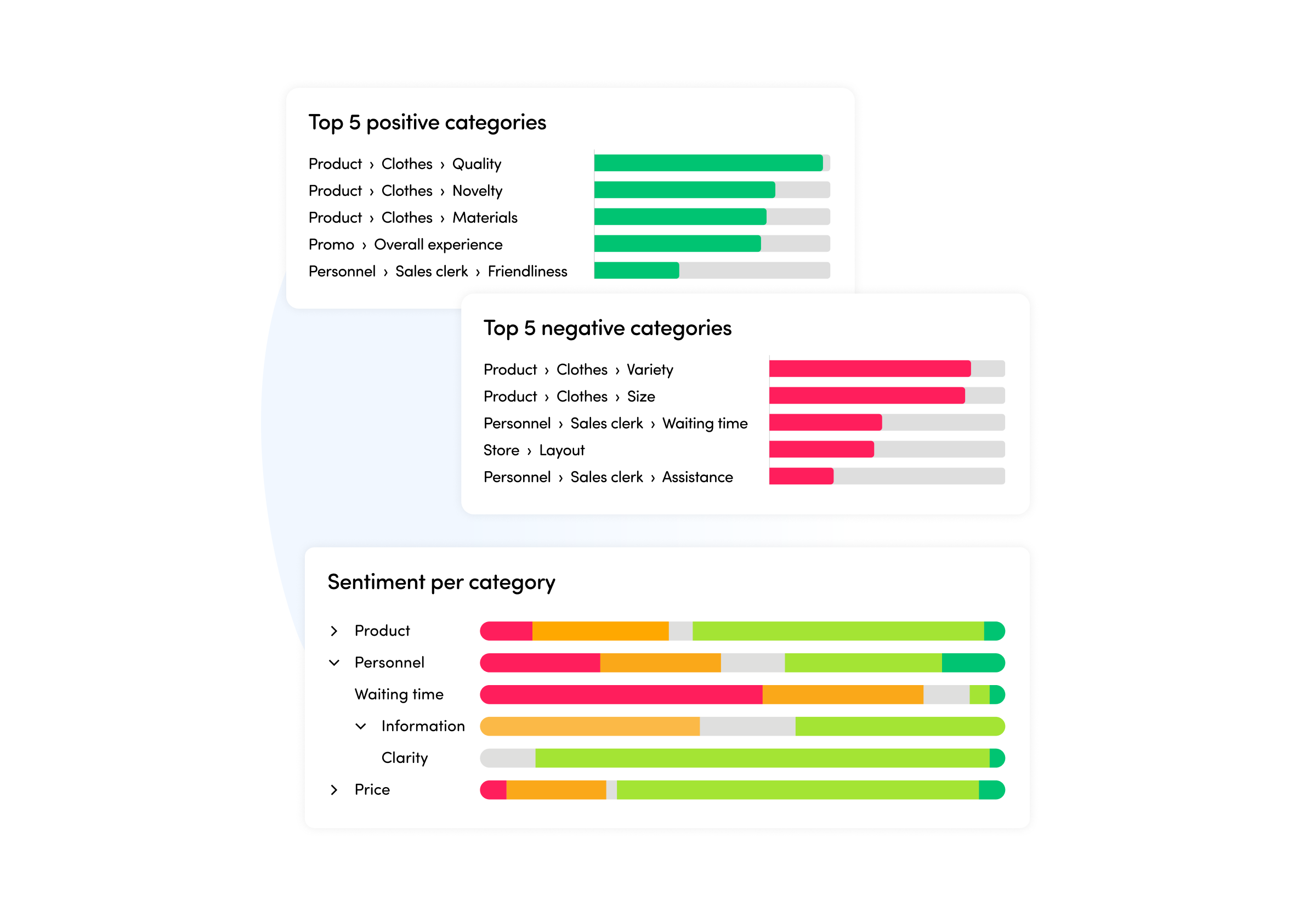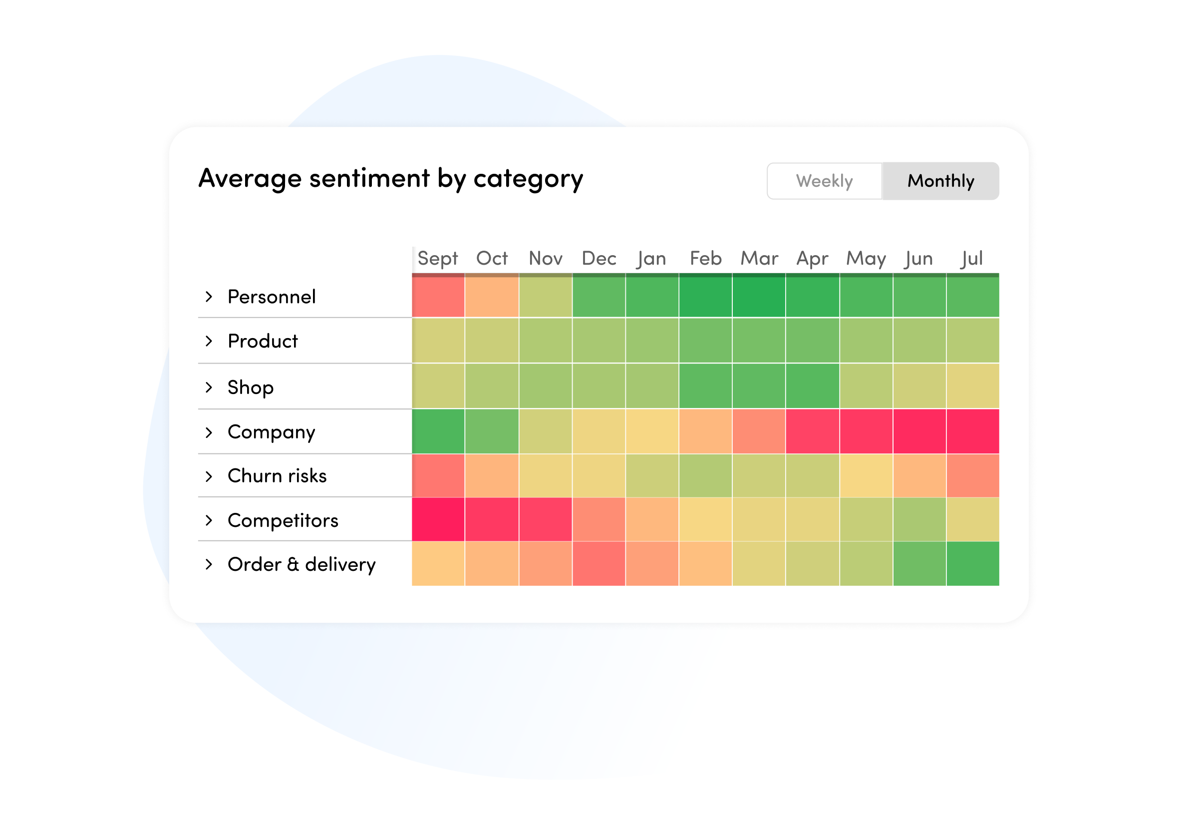 Monitor how customer sentiment evolves across categories such as product, personnel, delivery, or competitors. The heatmap reveals trends and emerging issues so teams can quickly identify improvements or risks in the customer experience.