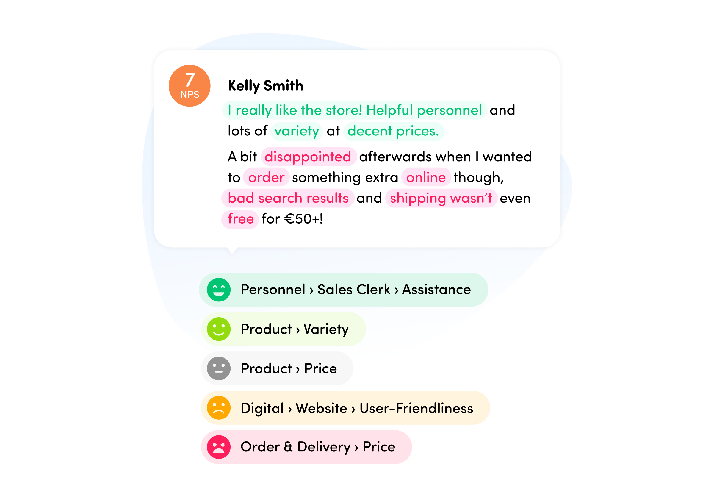 Hello Customer’s AI automatically analyzes open feedback, detects sentiment, and assigns topics to every comment. This allows teams to understand the context behind customer scores and turn unstructured feedback into clear, actionable insights.