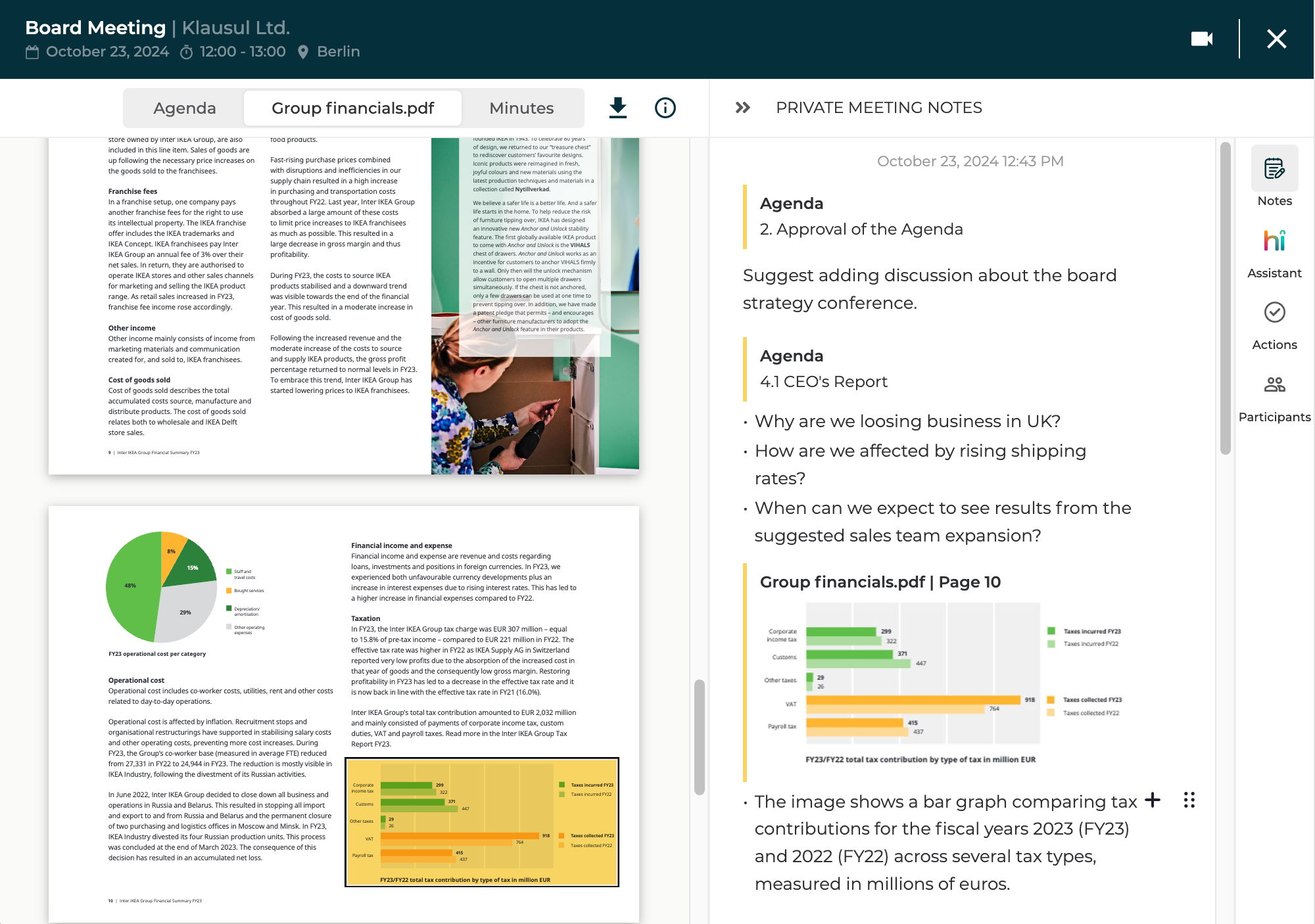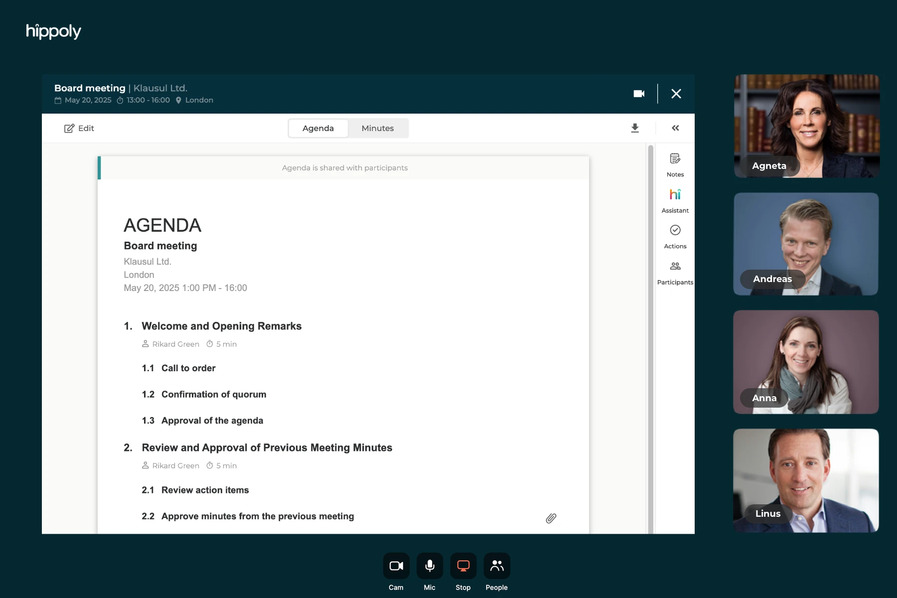 We highly appreciate the user-friendly and clear interface, as well as the possibility to keep files organised and easily accessible. Scheduling meetings and drafting agendas effortlessly by using pre-existing templates has also helped us greatly in saving time and keeping the format consistent. The functionality allowing the users to write meeting minutes directly in Hippoly is a practical and useful upgrade. Further, we are happy about the e-signing integration, it makes electronic signing of documents a fast, smooth and, at the same time, safe process.