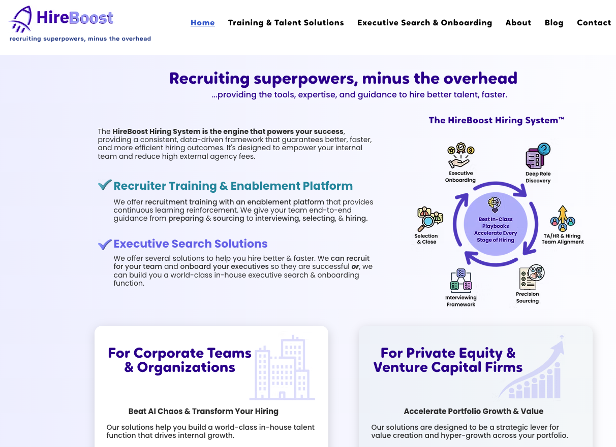 Hireboost can help your organization in multiple ways: Fully Outsourced Executive Search, Recruiting Team Training and Ongoing Support, or Do-It-Yourself System Software.