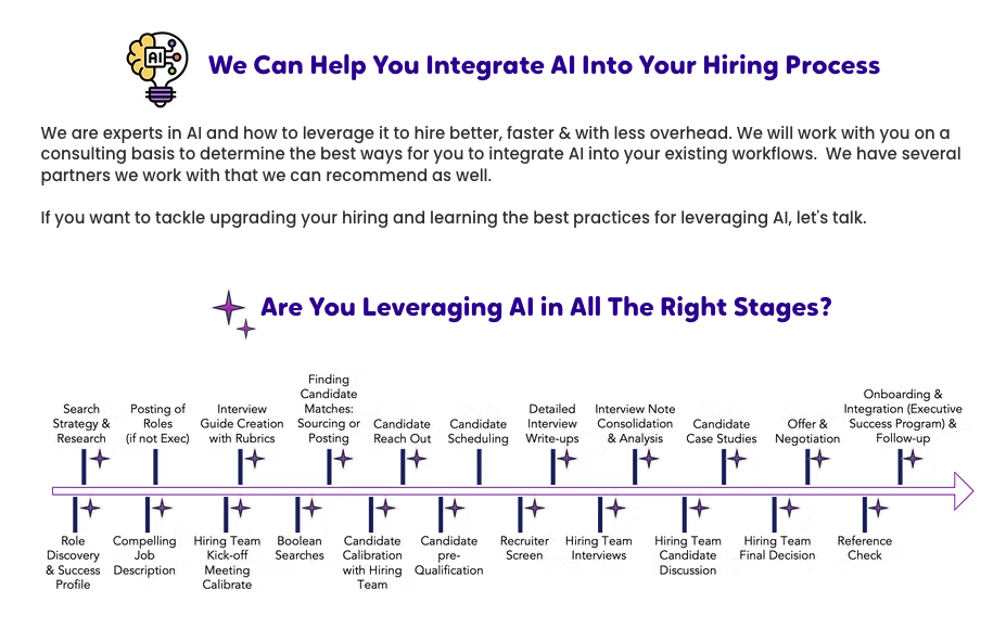 Executive Recruiting, Recruiter Training, AI Recruiting System, Executive Onboarding, Talent Advisory Locations Serviced