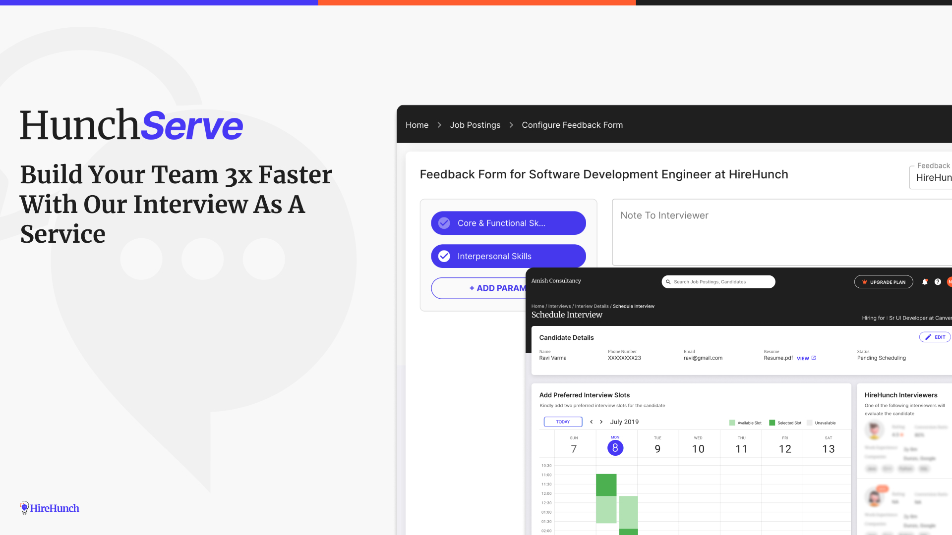 Furthermore, HireHunch recognizes the importance of freeing up your internal tech resources for focusing on strategic decisions. This is where HunchServe, our Interview as a Service, steps in, allowing businesses to leverage our panel of seasoned interviewers, often sourced from esteemed organizations like MAANG and other leading product companies. These interviewers possess extensive industry expertise, ensuring impartial and well-structured interviews. Each interview is complemented by a comprehensive feedback report and video playback, expediting the hiring process.
