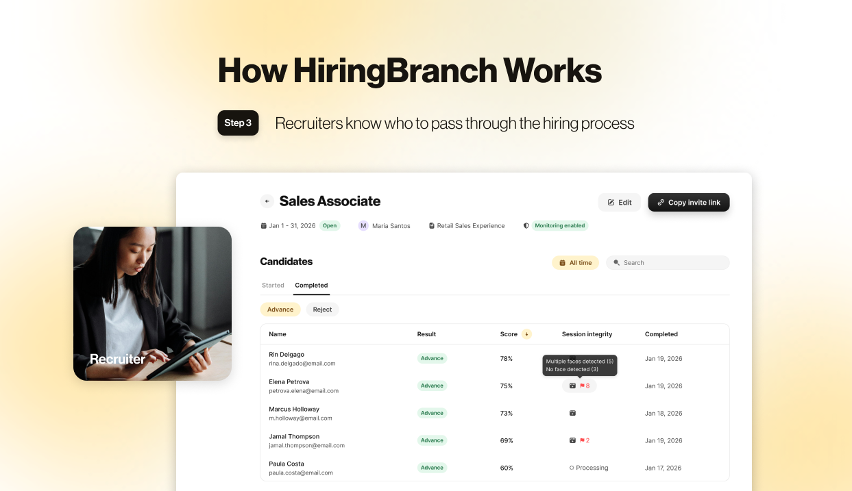 I love how HiringBranch has completely streamlined our recruitment process, saving us an enormous amount of time by eliminating interviews and group assessments. The platform is intuitive, mobile-friendly, and allows candidates to complete assessments at their convenience. Most importantly, it enables us to identify candidates with the right soft skills and genuine communication abilities, leading to higher training pass rates, better retention, and improved overall performance in our fundraising efforts. Review collected by and hosted on G2.com.
