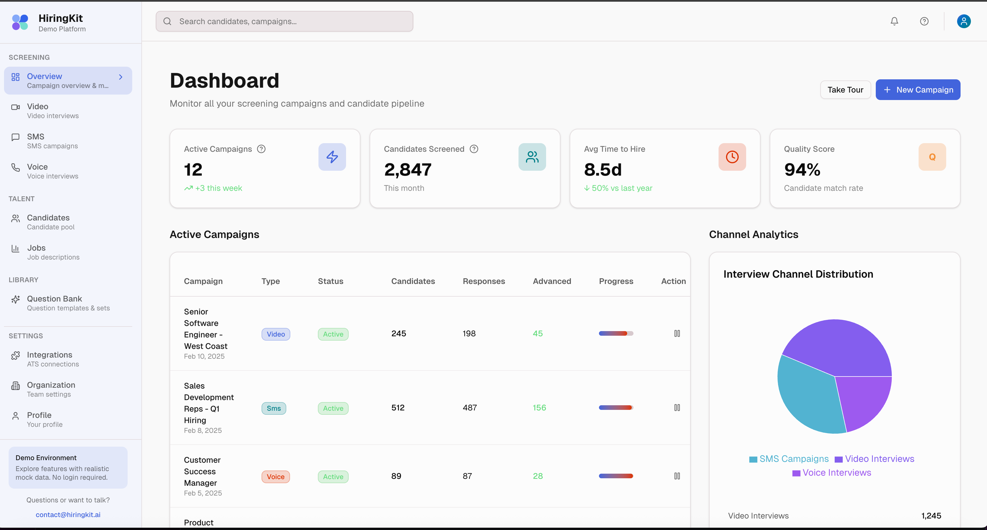 - Engages with candidates via website chatbot, landing page, social, SMS, email, and QR Codes