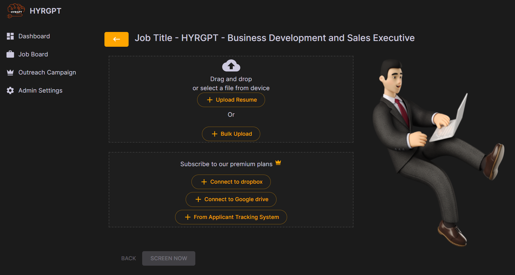 Candidates can be added in 3 different ways (1) Add resumes (2) Manual details update (3) Bulk Upload sheet. The platform only requires the name, email address and WhatsApp number to trigger the assessment