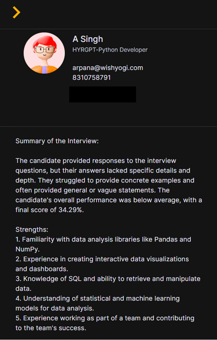 As soon as the interview is completed by the Gen AI engine, it autogenerates the summary of the strengths and weaknesses of the candidate, along with an assessment score. Recruiter can also choose to share the assessment with the candidate. Detailed report of the entire assessment and summary can...