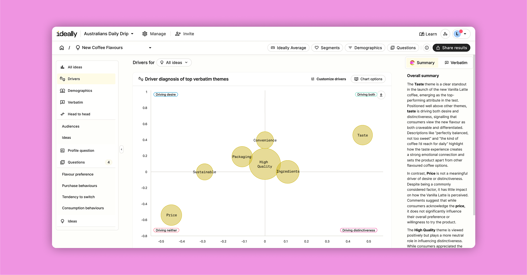 Ideally offers impressively fast, reliable, and consumer-focused insights that enable us to make decisions with confidence. The platform is user-friendly, the reporting is straightforward, and the turnaround time is outstanding—often providing valuable results overnight. We particularly appreciate the high quality of respondents and the comprehensive analytics, which make it easy for us to validate concepts, test claims, and assess price sensitivities quickly. Ideally has truly become a trusted partner for rapid, evidence-based decision-making. Review collected by and hosted on G2.com.