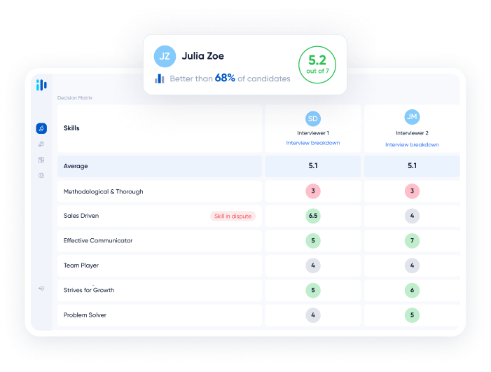 Get instant data after each interview to assess skills and align with co-interviewers. Say goodbye to vague impressions like 'I liked her' or 'He was impressive.' Focus post-interview discussions on resolving misalignments with data-driven insights.
