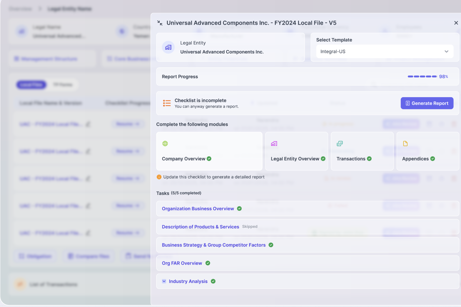 For multinational companies, Integral streamlines end-to-end transfer pricing compliance. Configure policies, manage intercompany agreements, and generate consistent Local Files, Master File sections, and CbCR outputs using structured templates and one-click roll-forwards. Our benchmarking workflows accelerate comparable selection while maintaining alignment with expert judgment, and our qualitative analysis uses AI to draft narratives with linked, audit-ready evidence. Every change is logged with approvals and version history to support OECD and local-country expectations.