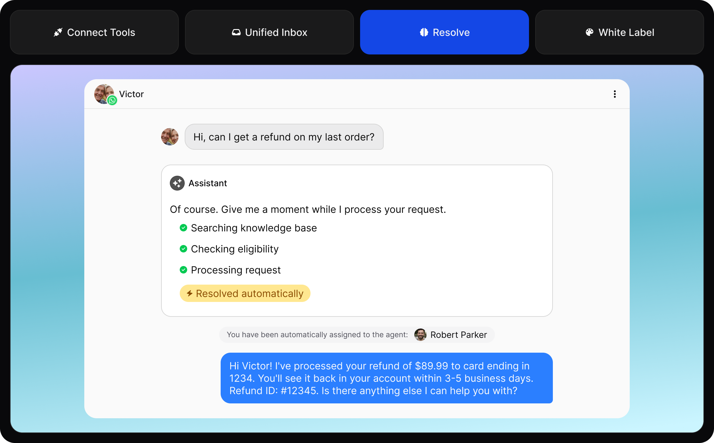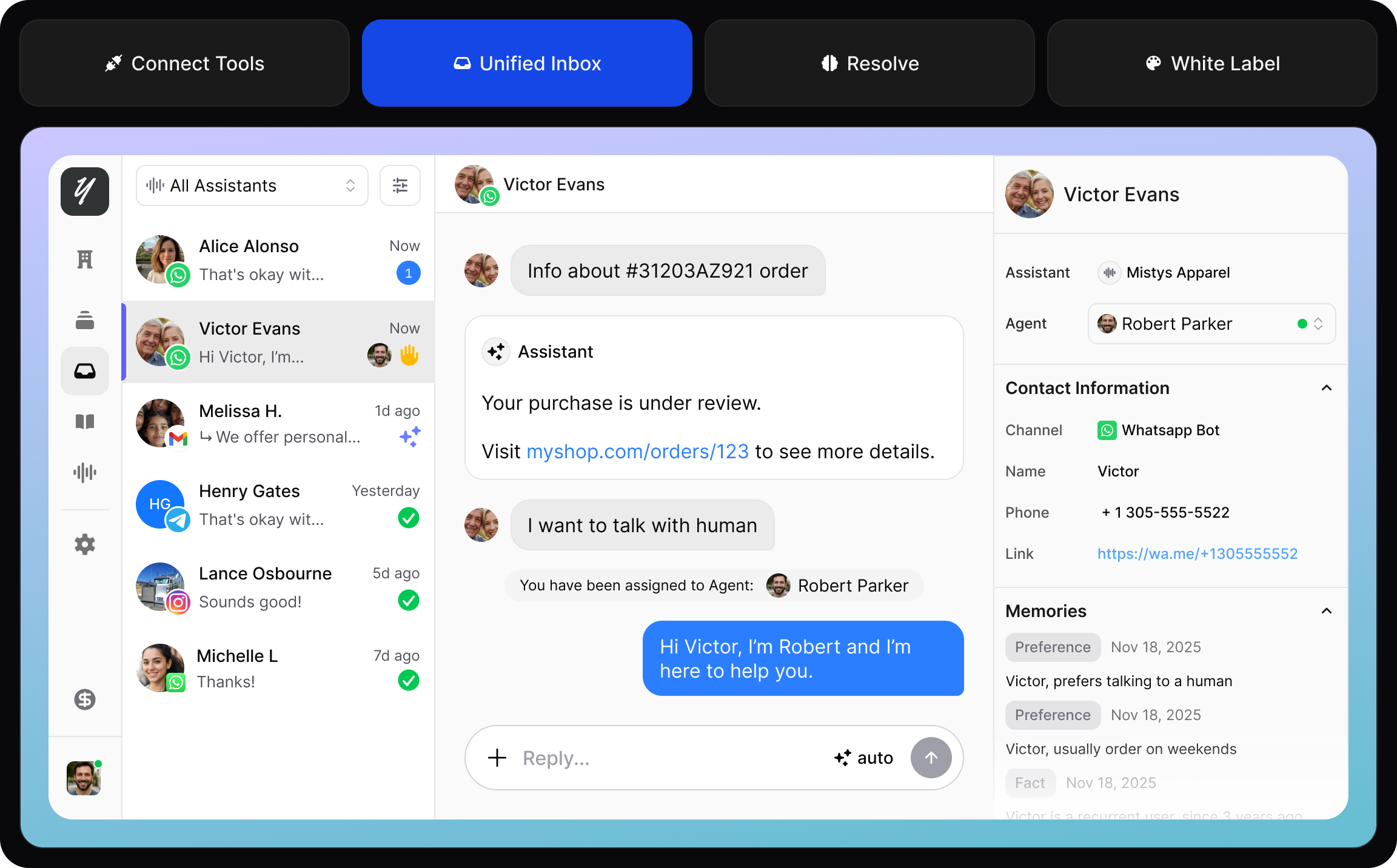 Tidio is an all-in-one AI customer support platform that includes help desk issue tracking, live chat, chatbot automation (Flows), and an AI customer service agent (Lyro). The platform allows businesses to manage all customer communication from a single dashboard, including email and social media channels like WhatsApp, Messenger, and Instagram. Tidio’s interactive widget functions as both a live chat plugin and a chatbot. With Flows, businesses can create custom chatbot-like automations to automatically provide answers to incoming messages, offer support, and generate leads. Additionally, Lyro uses your knowledge base and FAQs to provide accurate, helpful, and natural answers and solutions in your brand’s unique tone of voice. Lyro can achieve up to a 64% resolution rate, allowing your team to focus on more complex issues.