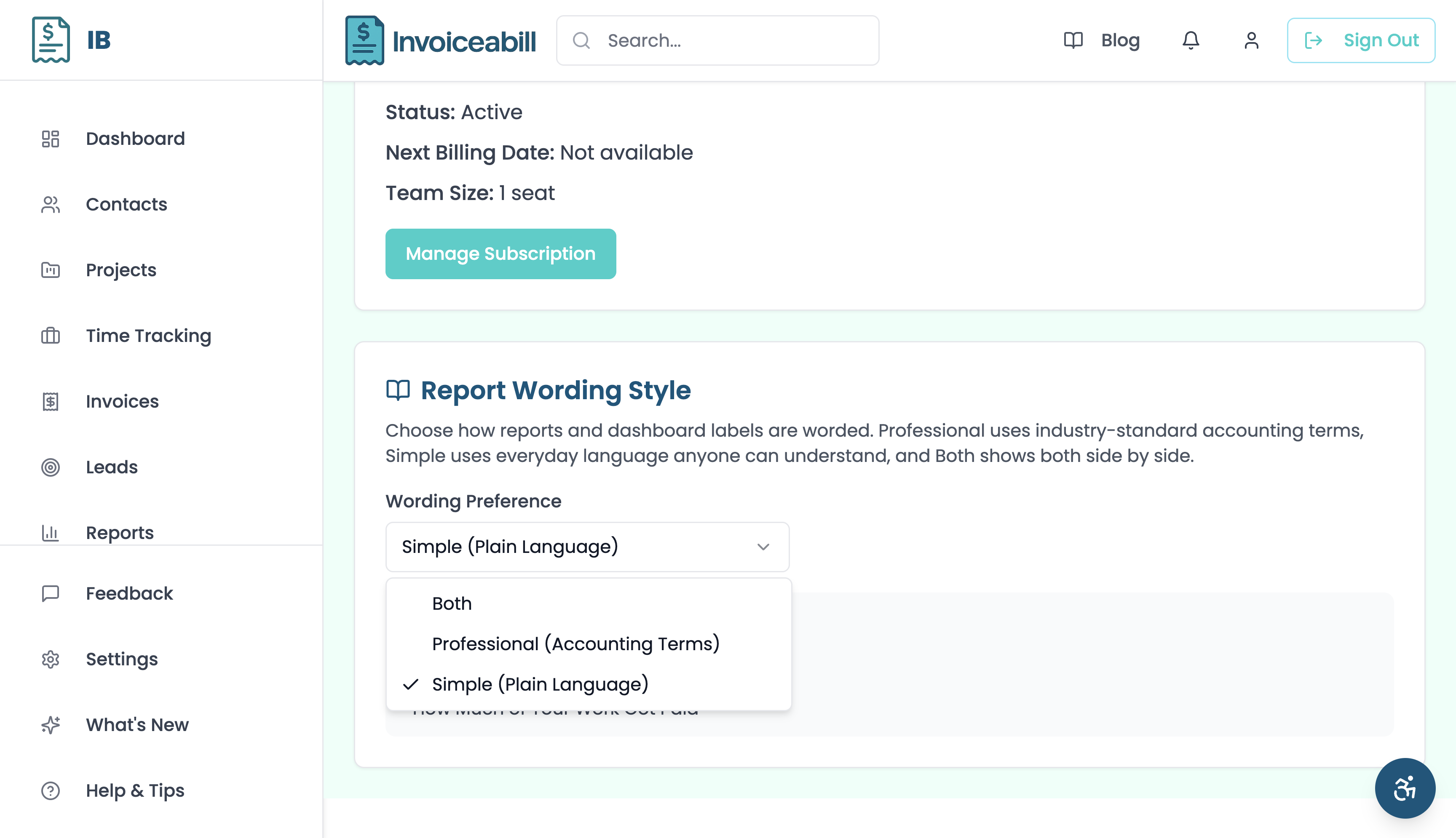 Invoiceabill includes a Plain English toggle that allows users to switch the entire dashboard between professional accounting terminology and everyday language, or display both side by side. Users can also customize their dashboard layout, hide unused features and form fields, and set organization-level defaults for faster form completion.