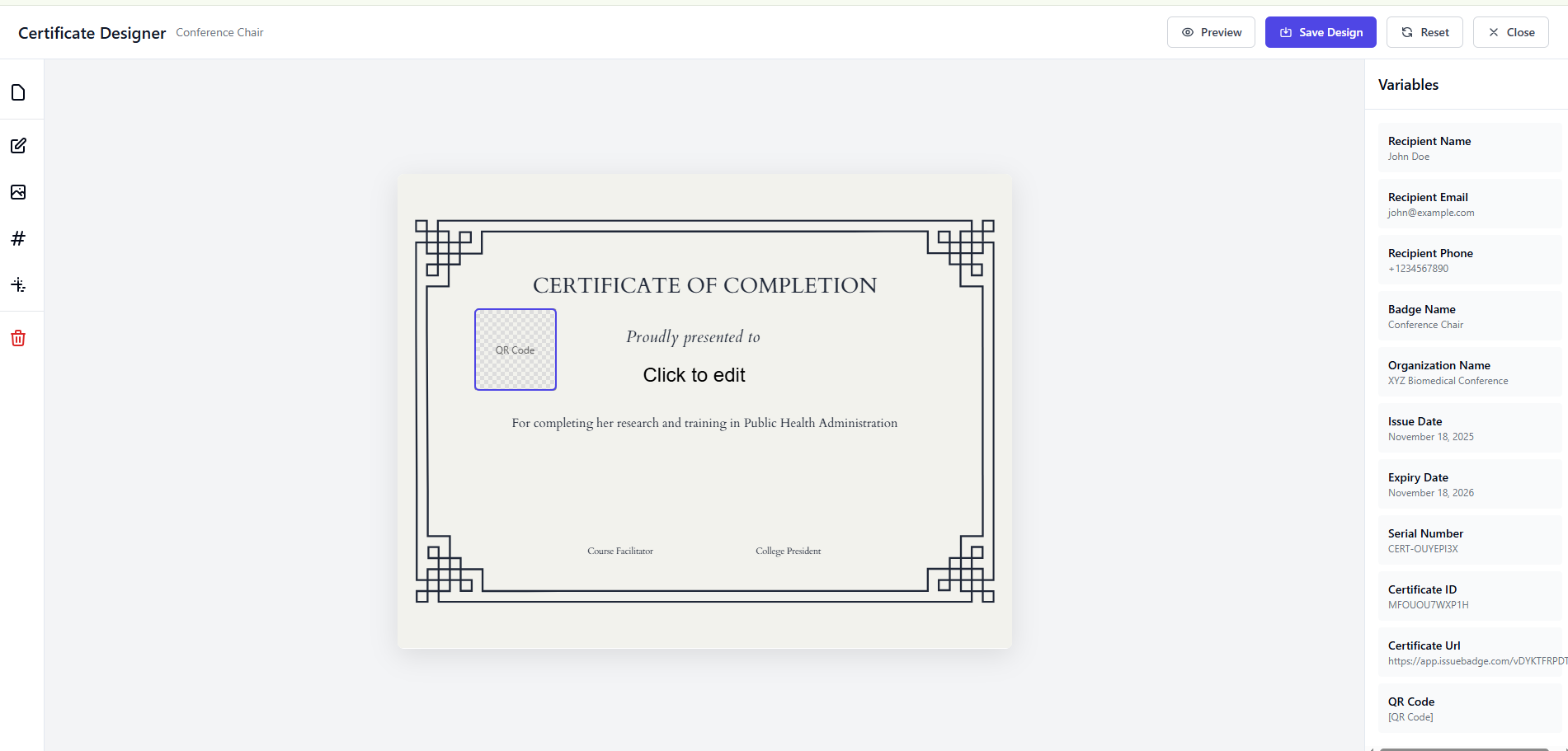 Designed to be simple yet powerful, IssueBadge requires no technical skills. Users can design beautiful certificates and badges in tools like Canva, then upload them to IssueBadge where dynamic data, QR codes, and verification links are automatically generated. Our platform ensures every certificate you issue is tamper-proof, secure, and globally verifiable, giving recipients confidence and helping organizations build trust.