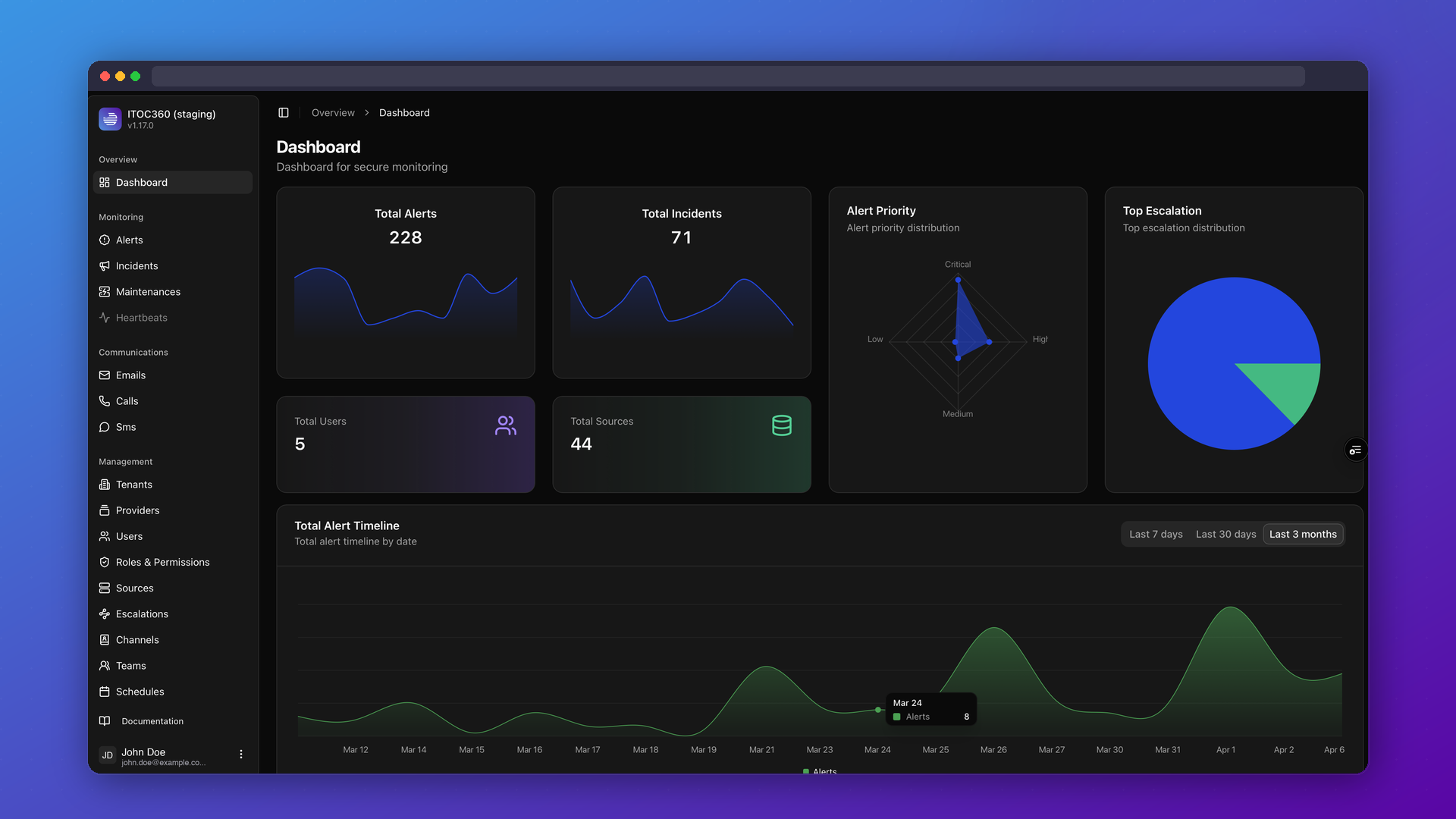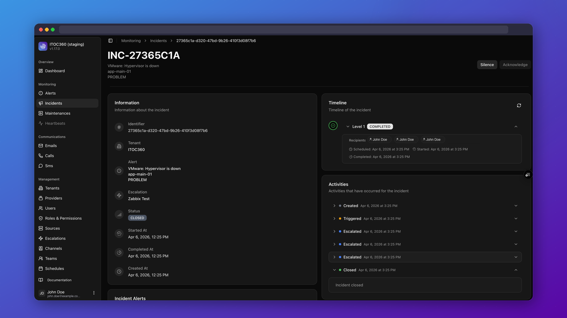 ITOC360 centralizes alert ingestion from your entire monitoring stack and uses AI to suppress noise, correlate related events, and identify what actually needs human attention. When a real incident is detected, the platform automatically triggers the right response: notifying the right people through their preferred channels, executing runbooks, and escalating based on defined policies.
