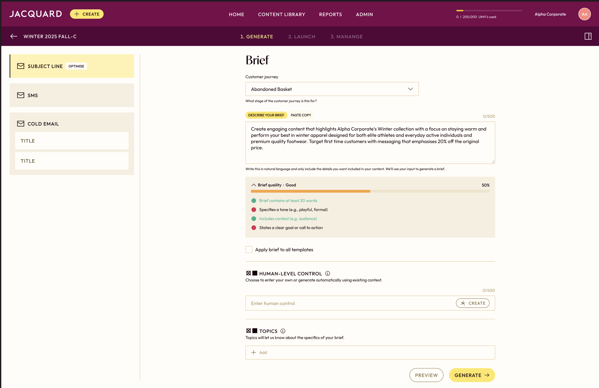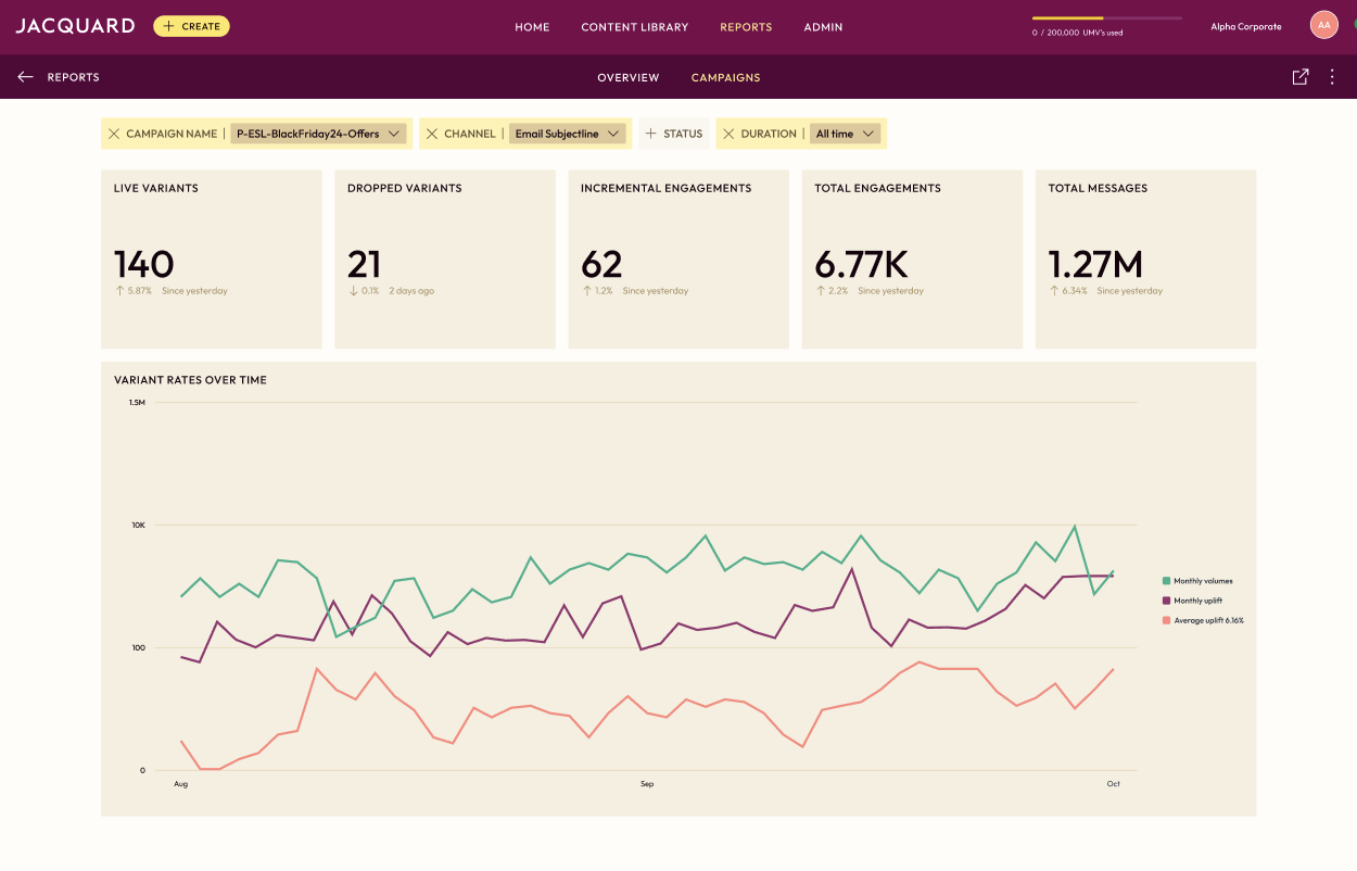 What we like most about Jacquard is its ability to consistently optimise subject lines at scale while staying on brand. It removes a lot of manual guesswork by using performance data to generate and select language that’s more likely to drive opens. Review collected by and hosted on G2.com.