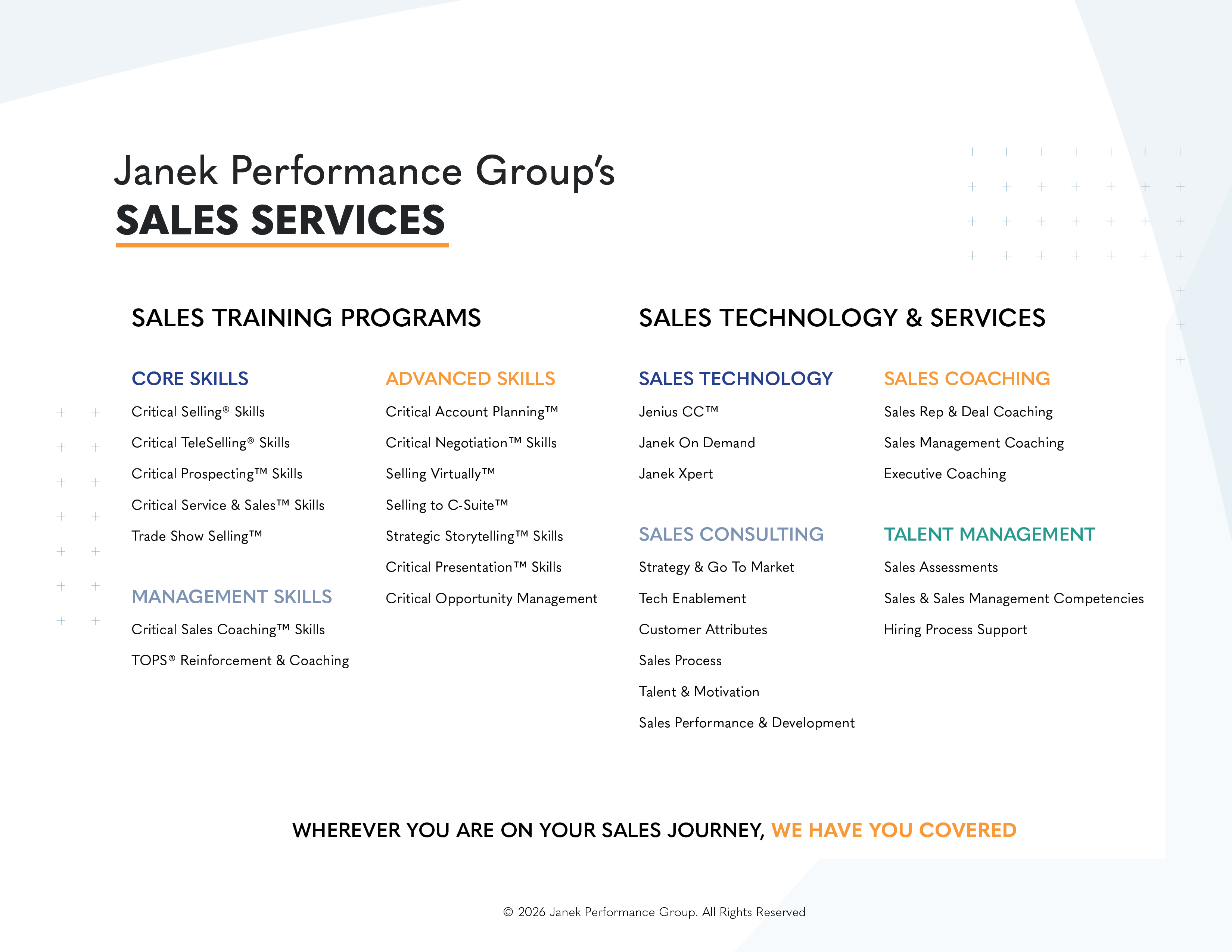 Janek Performance Group is an award-winning global sales performance company that provides a comprehensive solution across sales training, consulting, and AI-powered orchestration technology specifically designed to embed predictable sales execution into daily workflows.